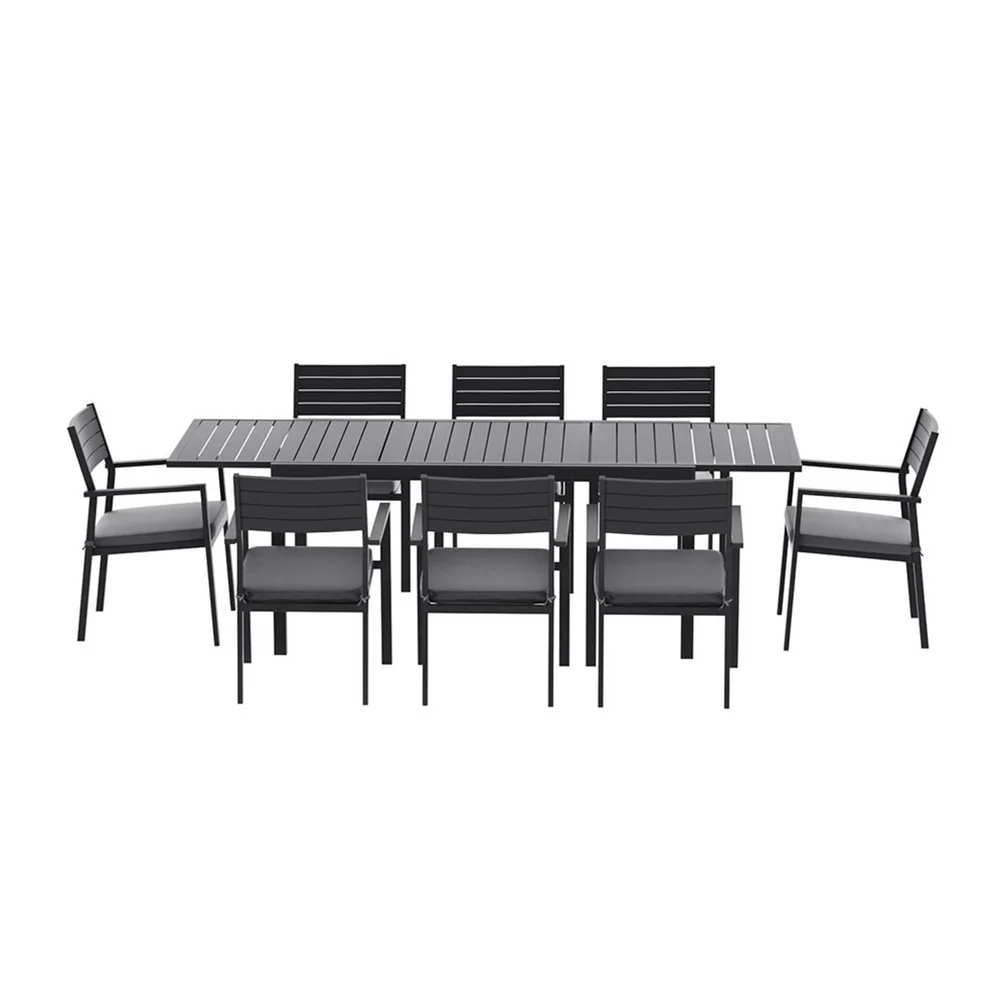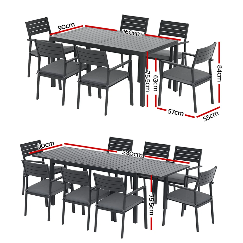 Gardeon 9PCS Outdoor Dining Set - Extendable Aluminium Table & Chairs, Seats 8, Black with Grey Cushions, Patio Ready