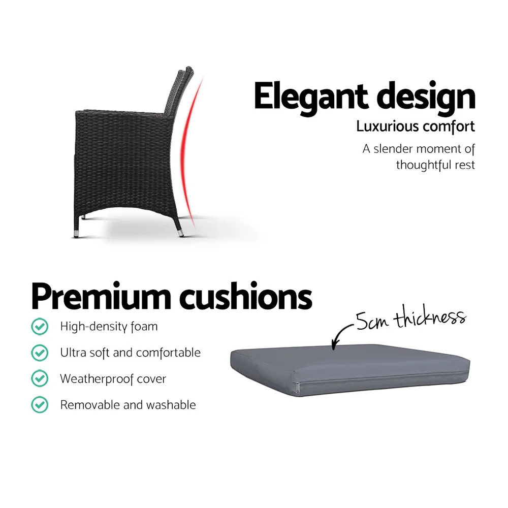 Experience outdoor elegance with the Gardeon 3PC Bistro Set. This chic ensemble includes a glass-top table and two wicker chairs, perfect for leisurely chats or coffee breaks. Crafted with a sturdy steel frame and UV-resistant PE wicker, it promises durability and style. The set features high-density foam cushions with washable covers and a parasol hole for sun protection. Designed for both indoor and outdoor use, it combines functionality with refined aesthetics, making it a versatile addition to any space.