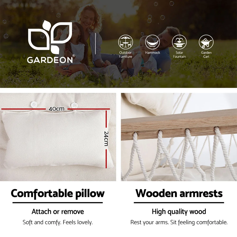 Indulge in ultimate relaxation with the Gardeon Hammock Chair with Steel Stand. Perfect for indoor and outdoor use, this hammock chair features a durable polyester cotton blend fabric and a solid timber rail for strength. The weather-resistant, powder-coated steel frame ensures longevity, while the cross-shaped base supports up to 120kg. Easy to install, it offers 360° rotation and includes a padded seat, detachable pillow, and solid timber armrests for added comfort. Embrace serenity with Gardeon today!