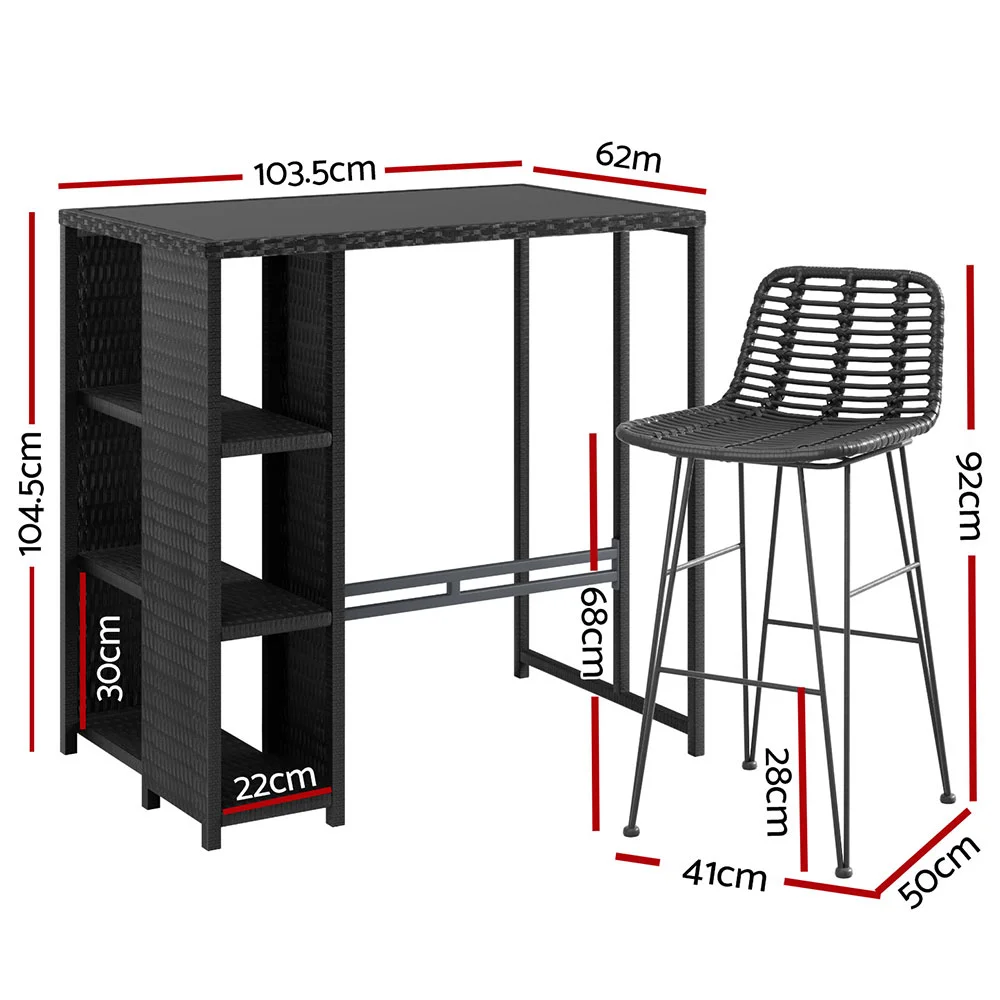 Enhance your outdoor ambience with the Gardeon Outdoor Bar Set. This elegant patio furniture set includes a sleek bar table and two comfortable chairs, perfect for dining or entertaining. Built with UV-resistant PE wicker and a sturdy powder-coated steel frame, this set is designed to endure all weather conditions. The chairs feature slanted backrests and footrests for relaxation, while the table offers ample storage with hand-woven detailing and a 5mm tempered glass top. Easy to assemble, it also comes with a 1-year warranty.