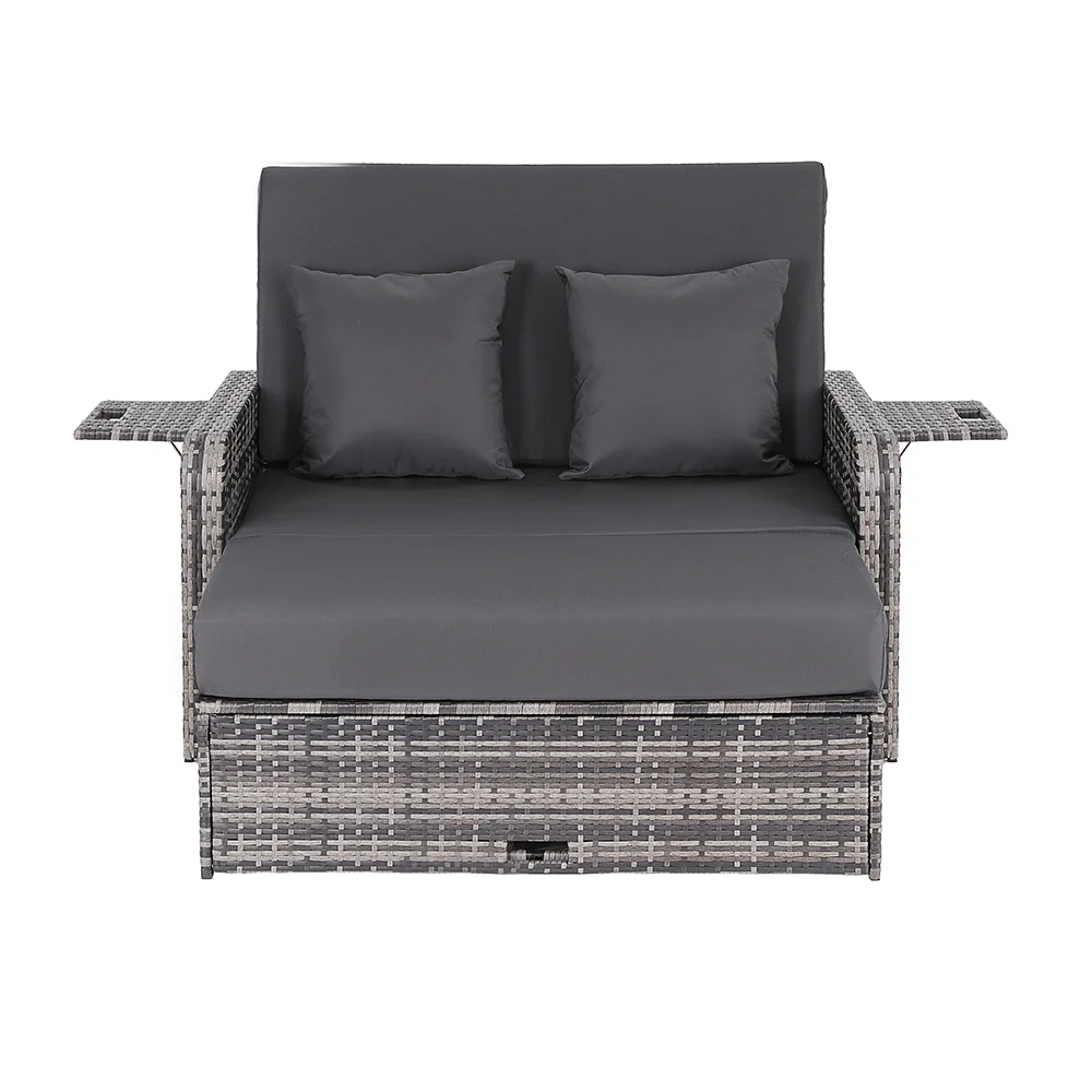 Unwind in luxury with the Gardeon Outdoor Day Bed Sun Lounge Setting. This versatile patio set seamlessly transforms from a cosy love seat to a lavish outdoor day bed. With a 4-position adjustable backrest, you can sit, recline, or lie flat in ultimate comfort. Crafted with a durable metal frame and weather-resistant PE rattan, it's perfect for poolsides, gardens, or balconies. Enjoy added convenience with retractable side trays, removable cushions, and a multi-functional ottoman for storage or extra seating. Its space-saving design allows you to tuck the ottoman underneath when not in use, making it an ideal addition for solo relaxation or entertaining. Experience the perfect blend of comfort and style with Gardeon's elegant outdoor furniture.
