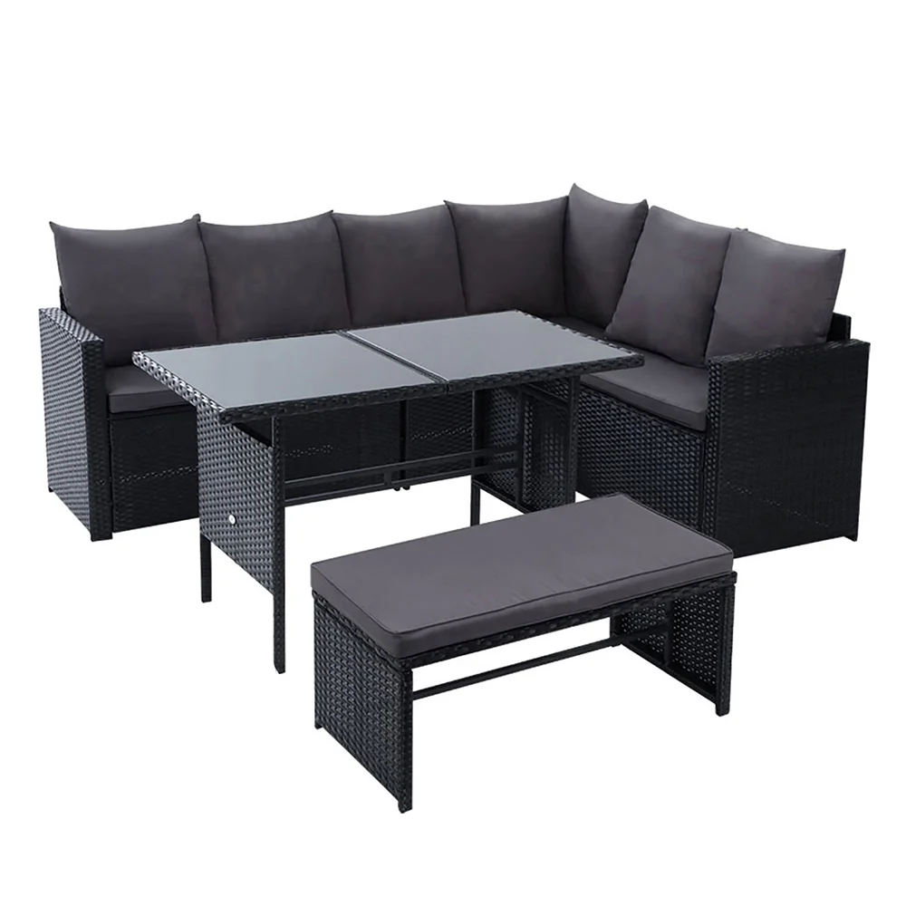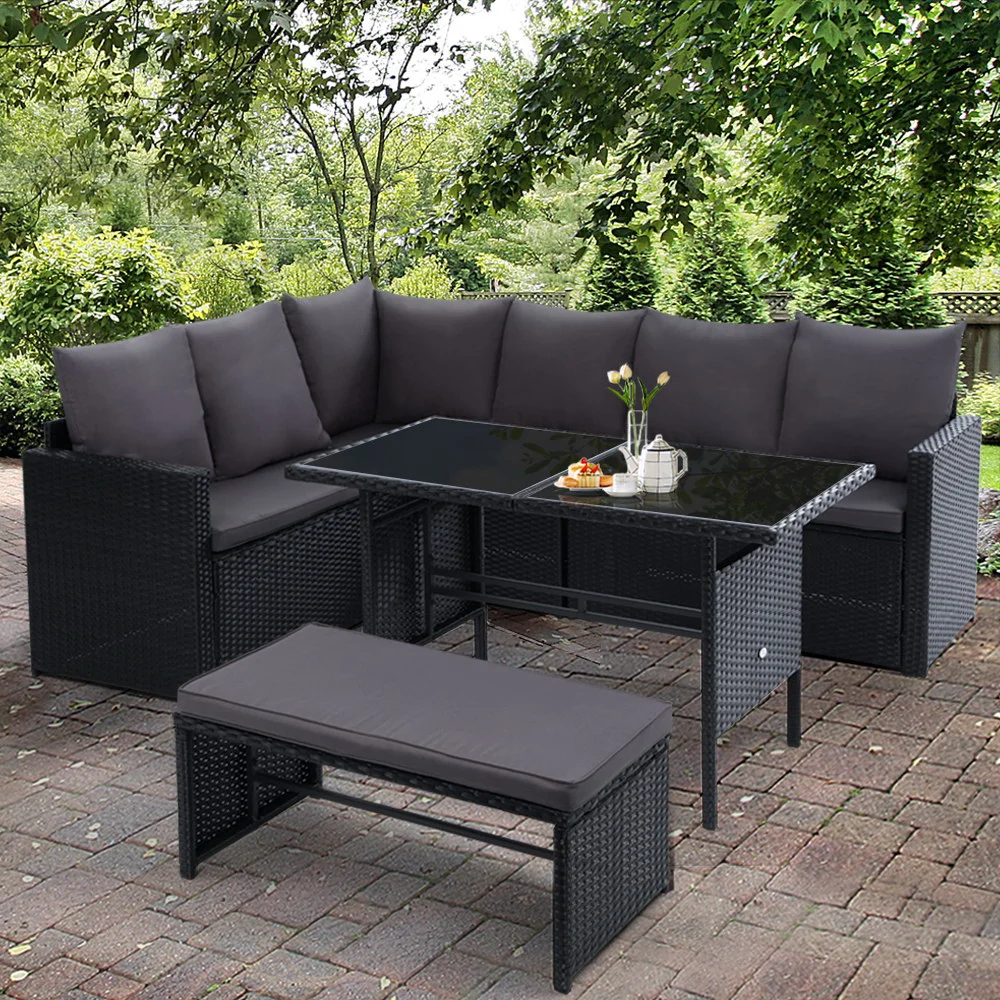 Elevate your outdoor gatherings with the Gardeon Outdoor Dining Set. This 9-seater sofa lounge offers versatility with flexible seating arrangements and secure hook attachments. Crafted with a durable powder-coated steel frame and stylish PE wicker, it withstands UV rays and weather conditions. Enjoy plush comfort with water-resistant cushions and pillows. The set features a 5mm tempered glass table-top and includes a protective cover for longevity. Choose from four elegant models to complement your garden.