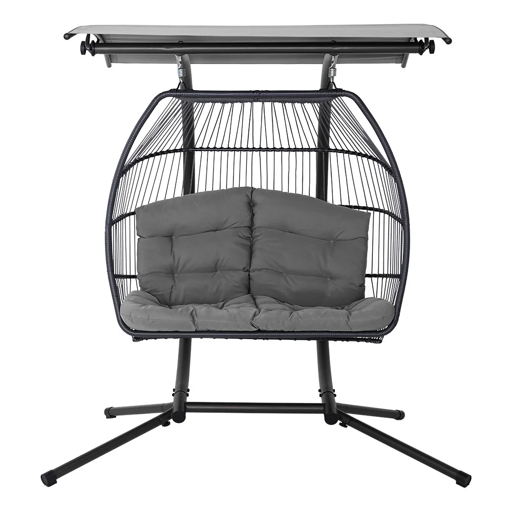 Gardeon Double Hanging Egg Swing Chair with Canopy, Hand-Woven Wicker, Steel Frame, 2-Seater, UV Resistant, Grey