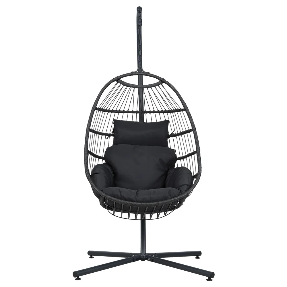 Gardeon Outdoor Egg Swing Chair - Grey Resin Wicker, 195cm Anti-Rust Frame, Plush Cushions, Foldable Pod Stand Included