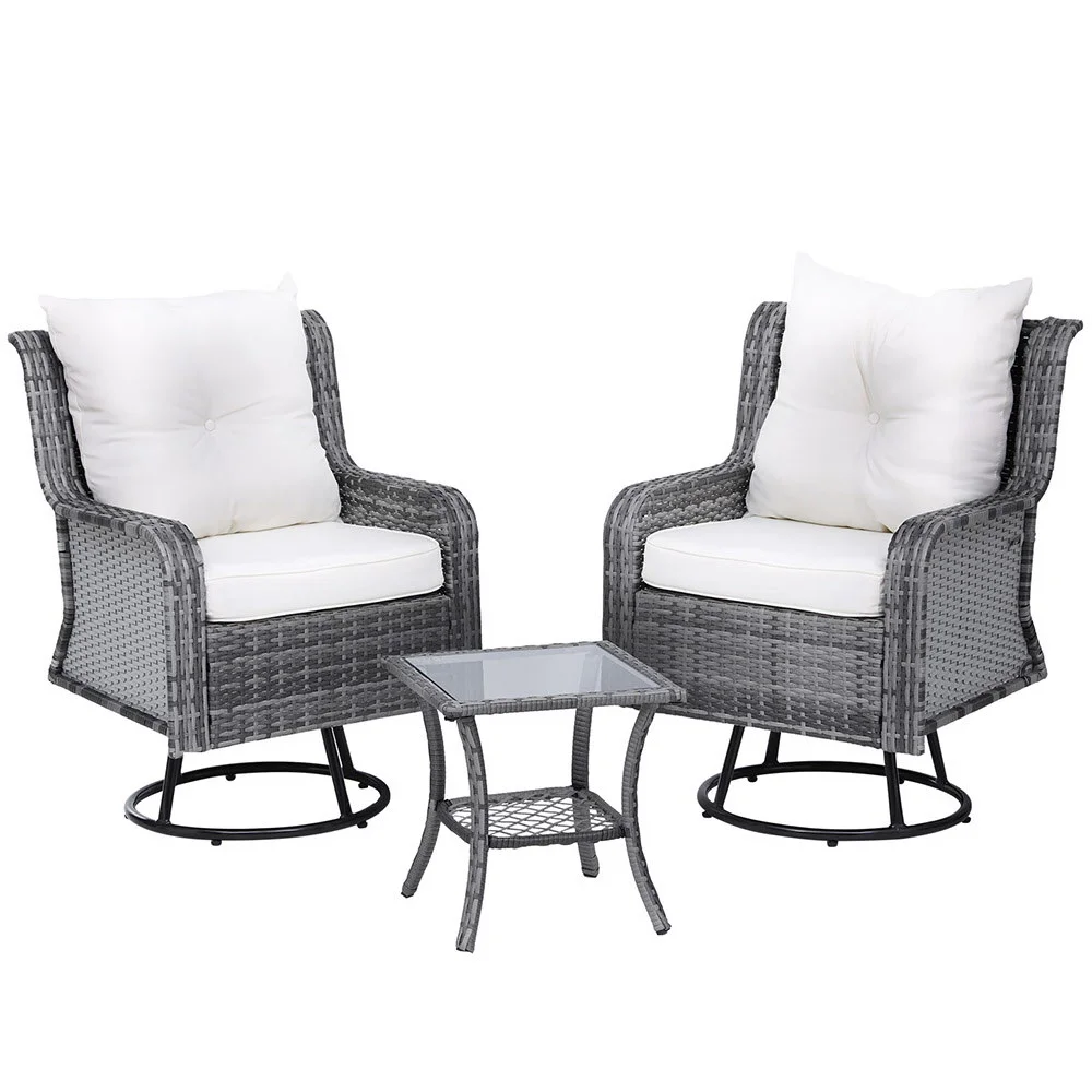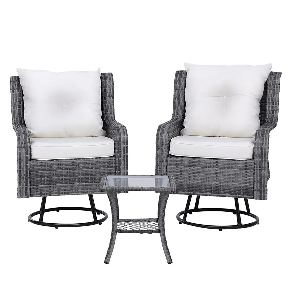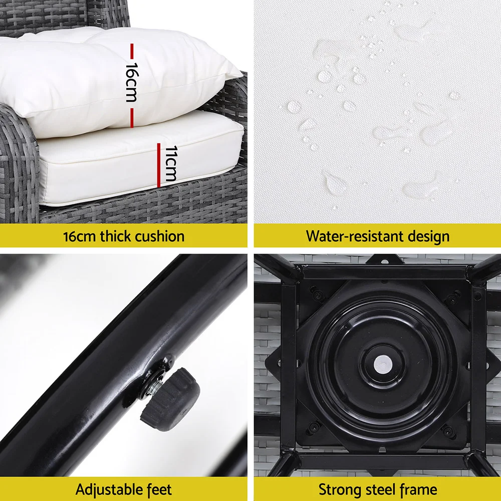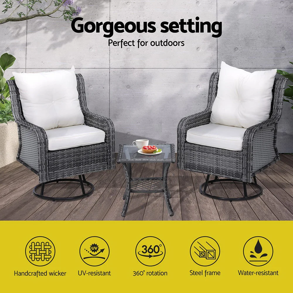 Gardeon 3PC Grey Wicker Bistro Set: Swivel Chairs & Table, UV-Resistant Cushions, Steel Frame, Indoor/Outdoor Use