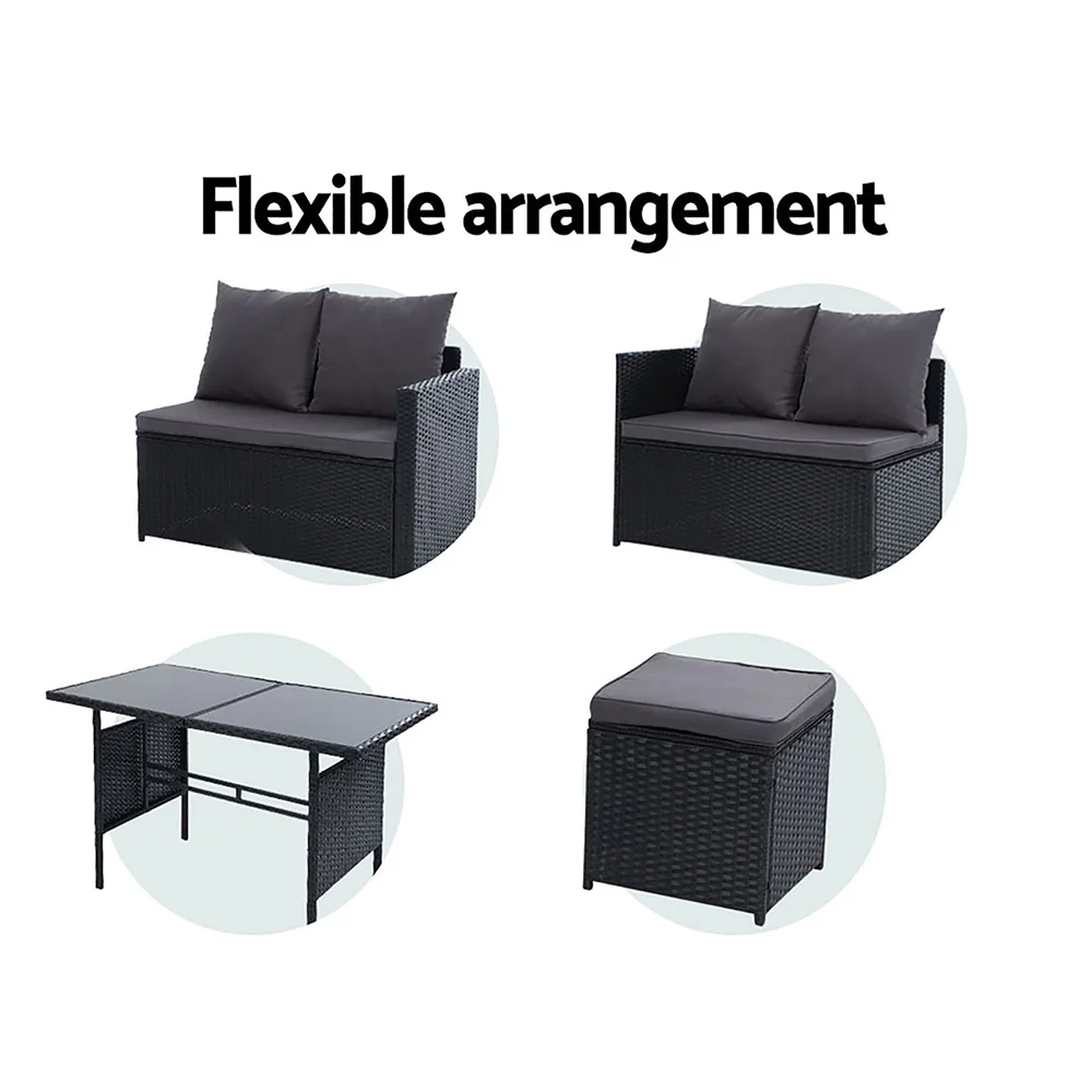 Experience outdoor luxury with the Gardeon Outdoor Furniture Dining Setting Sofa Set Lounge Wicker 9 Seater in Black. Perfect for gatherings or relaxation, this versatile set features a stylish PE wicker finish and a sturdy powder-coated steel frame. UV and weather-resistant, it offers comfort with water-resistant cushions and a tempered glass table top. Customise your seating arrangement effortlessly with secure hooks, and enjoy easy maintenance with removable, washable covers. Choose from four chic models to match your style.