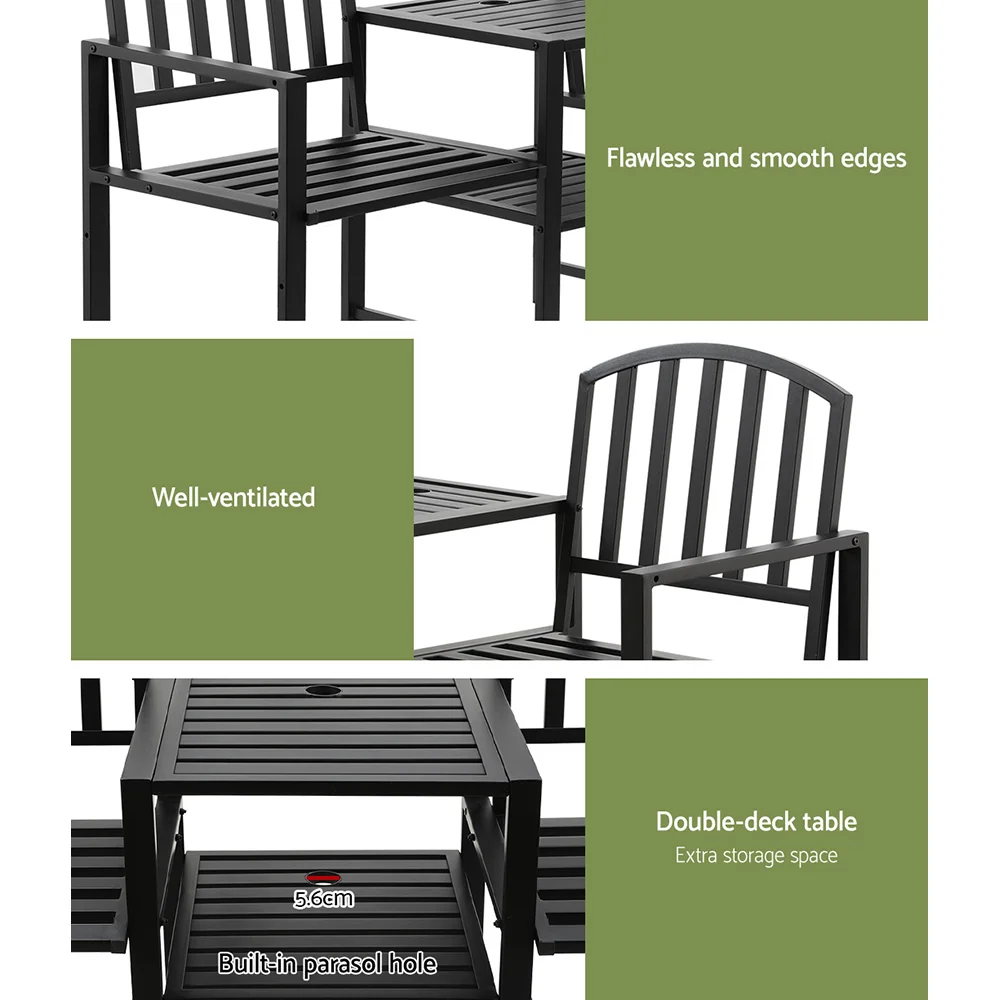 Gardeon 2-Seater Outdoor Garden Bench Loveseat with Table, Black Steel, Weather-Resistant, 165cm x 50cm x 87.5cm