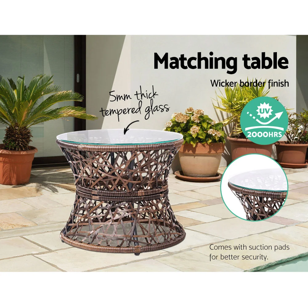 Experience ultimate relaxation with the Gardeon Outdoor Lounge Setting. This set includes two rotund Papasan chairs, each with a plush 10cm padded cushion, and a matching side table. Crafted from UV-resistant PE wicker and a sturdy steel frame, the chairs offer 360-degree rotation for versatile seating. The set is perfect for indoor or outdoor use and features easy-to-clean removable covers. The side table boasts a 5mm tempered glass top, enhancing its elegant appeal.