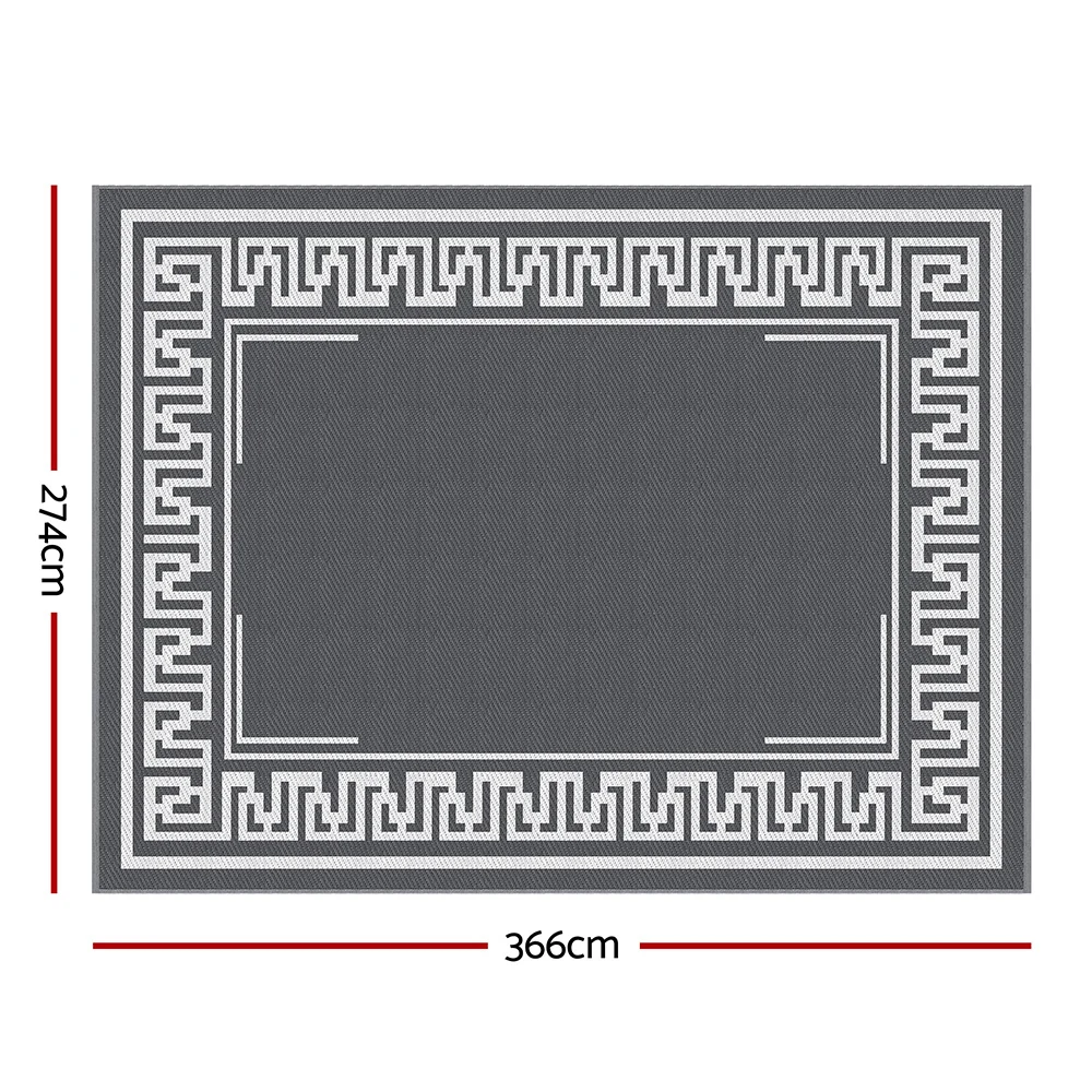 Elevate your outdoor ambience with the Gardeon Outdoor Rug, a versatile masterpiece that promises both style and functionality. Measuring an impressive 274x366cm, this large, reversible area mat features a chic Greek Key design on both sides, offering an instant refresh to patios, decks, or any outdoor setting. Made from premium polypropylene with a UV and heat-resistant coating, it withstands fading, water, and wear while remaining delightfully soft underfoot. Lightweight and portable, it's perfect for gardens, beaches, RVs, and more. Easy to clean with just a hose, this rug is your ideal companion for endless outdoor adventures.