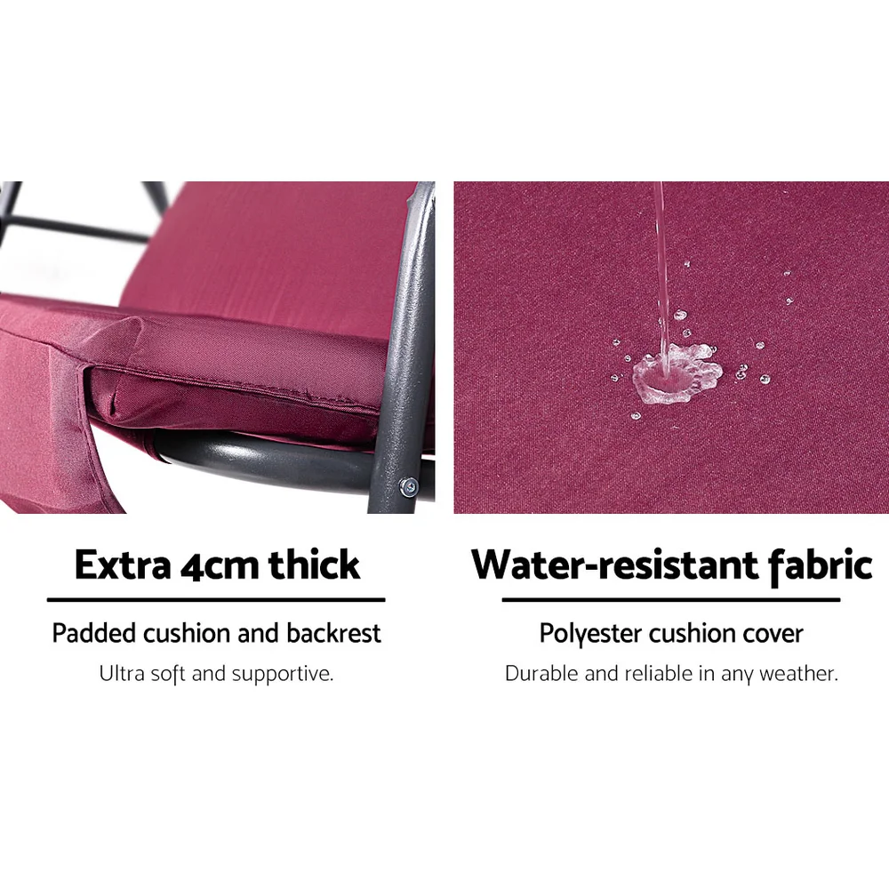Gardeon Wine Red 3-Seater Outdoor Swing Chair with Adjustable Canopy, Powder-Coated Steel Frame, and Removable Cushions