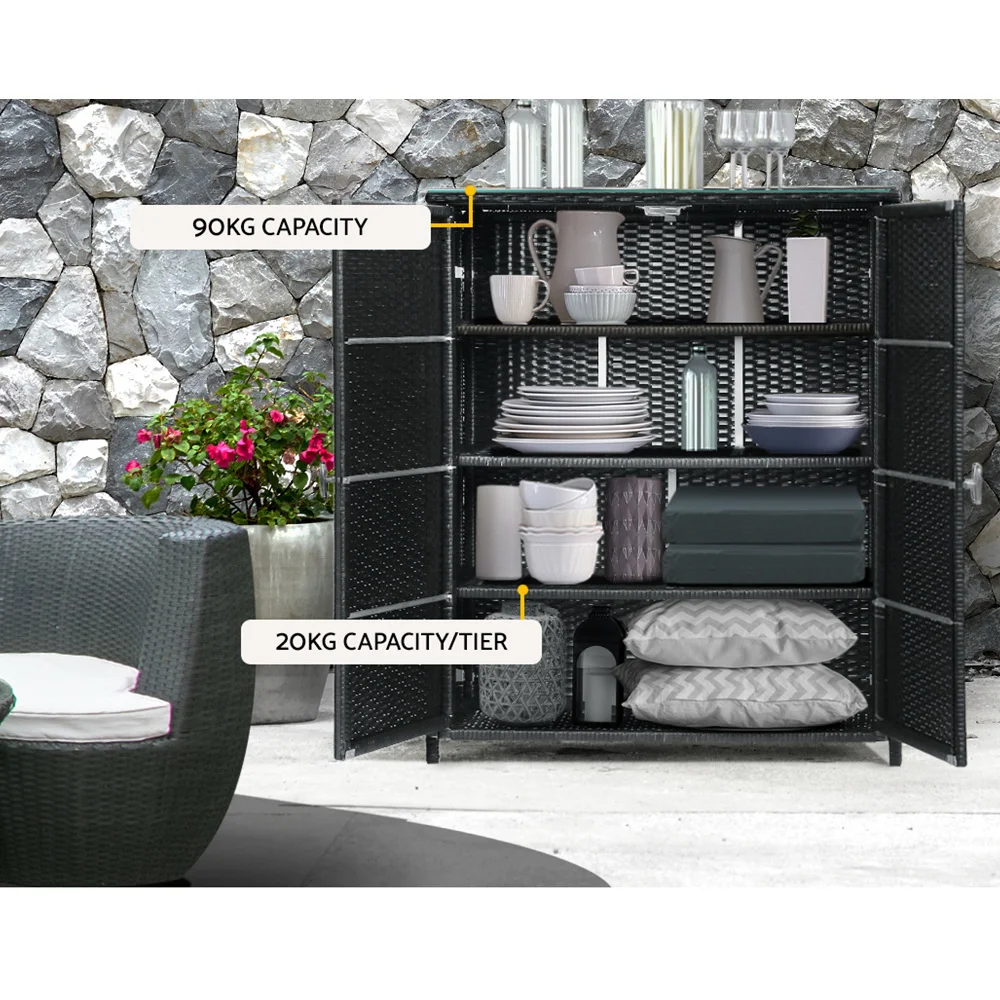 Gardeon Outdoor Wicker Storage Cabinet – Handwoven PE, Aluminium Frame, 2-in-1 Design with Glass Top, 103x84x40cm, Black
