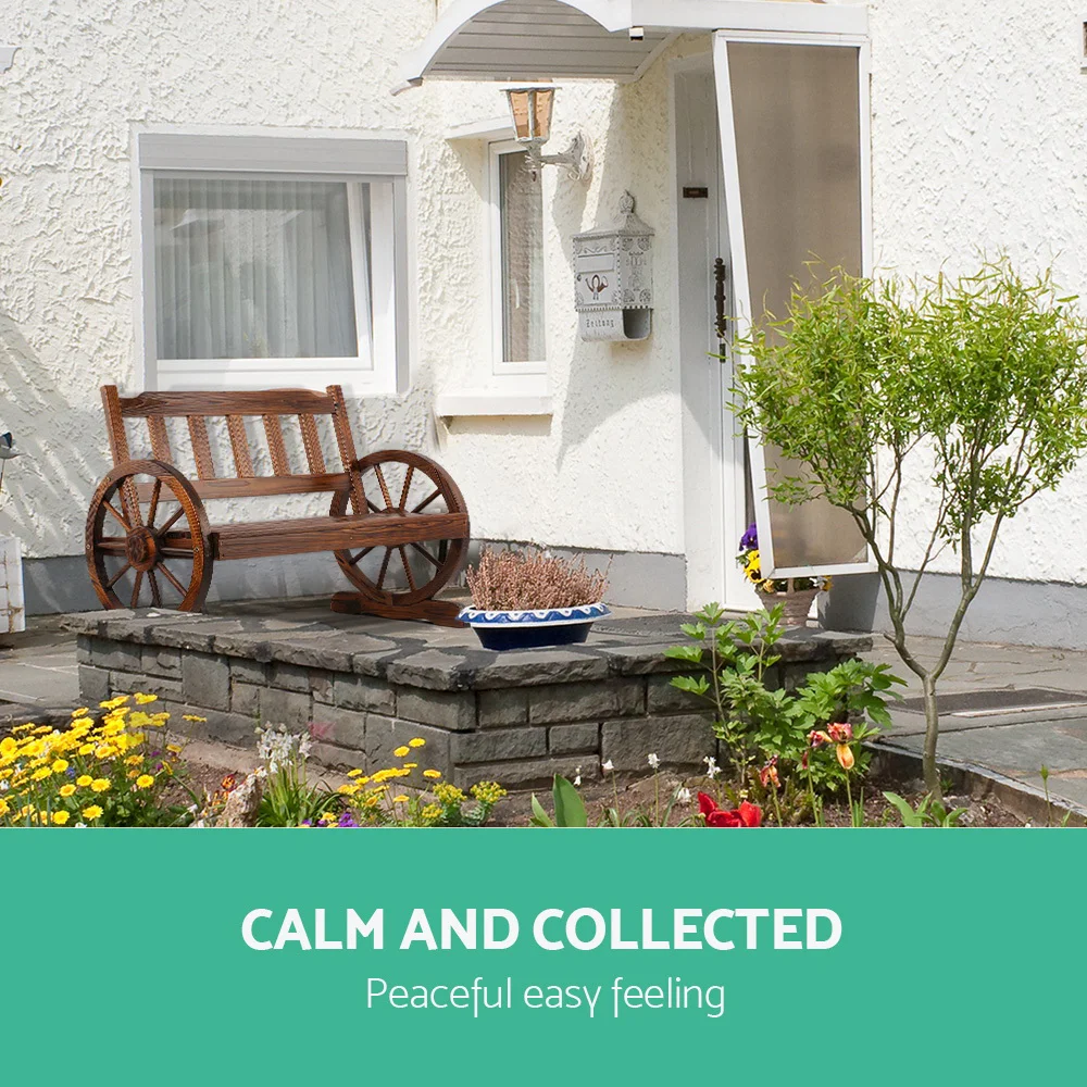 Embrace the rustic charm of the Wild West with the Gardeon Outdoor Garden Bench. Perfect for two, this Wagon Wheels Bench boasts period styling and a robust Fir wood construction with a burnt wood finish for historical allure. Weather-resistant and UV-protected, it promises durability under the Australian sun. With a 220kg capacity, wagon-wheel armrests, and an optional backrest, it combines style with comfort. Easy to assemble and low-maintenance, this bench is your ideal garden companion.