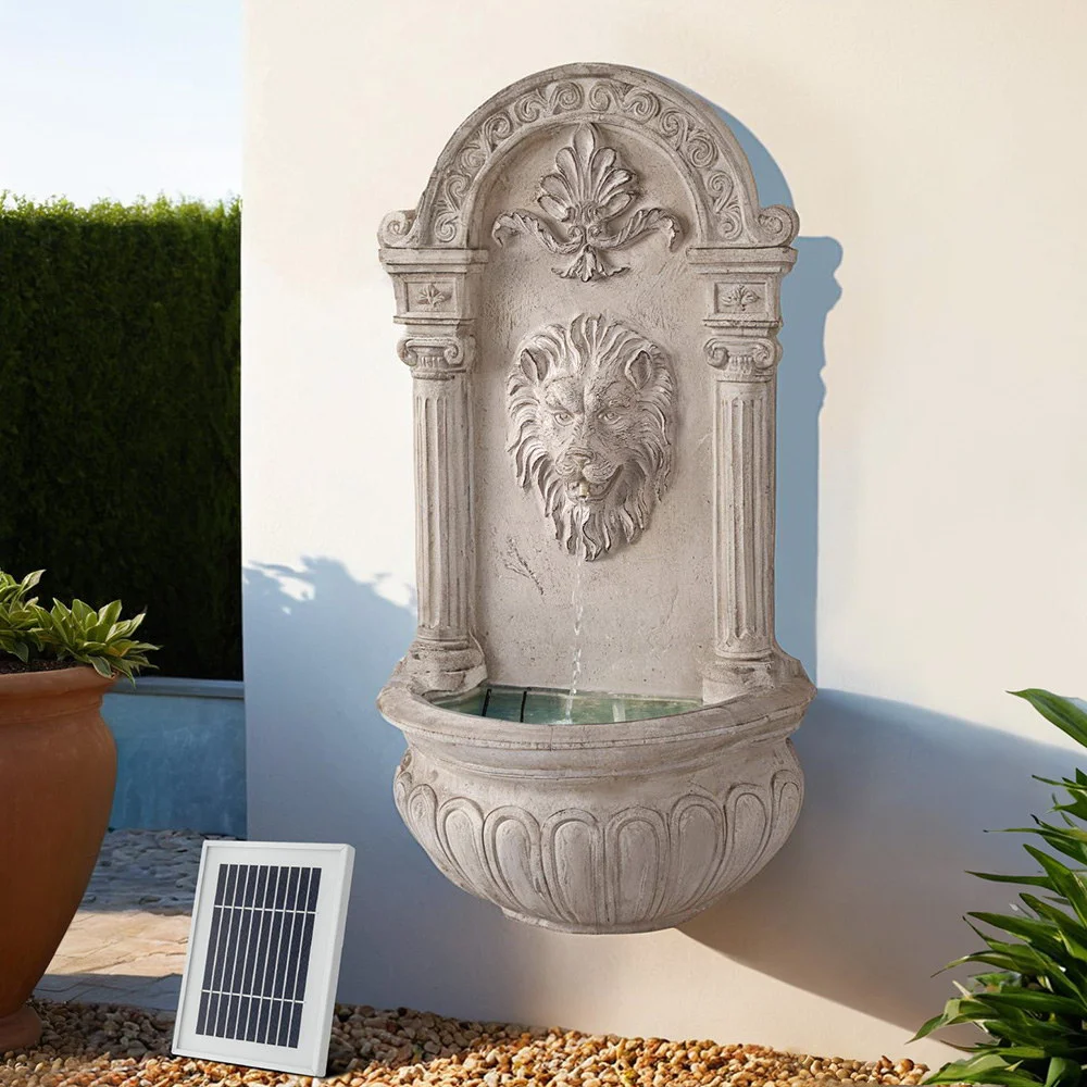 Elevate your outdoor decor with the Gardeon Solar Fountain Water Feature. This 77cm beige fountain showcases a timeless lion head design, offering a tranquil cascading water effect. Perfect as a wall-mounted or freestanding feature, it includes three LED lights for day-to-night ambience. Solar-powered with an efficient panel and rechargeable battery, it ensures uninterrupted beauty even after sunset. Easy to set up and maintain, it includes a water pump for optimal circulation, making it an eco-friendly centrepiece for gardens, patios, or courtyards.