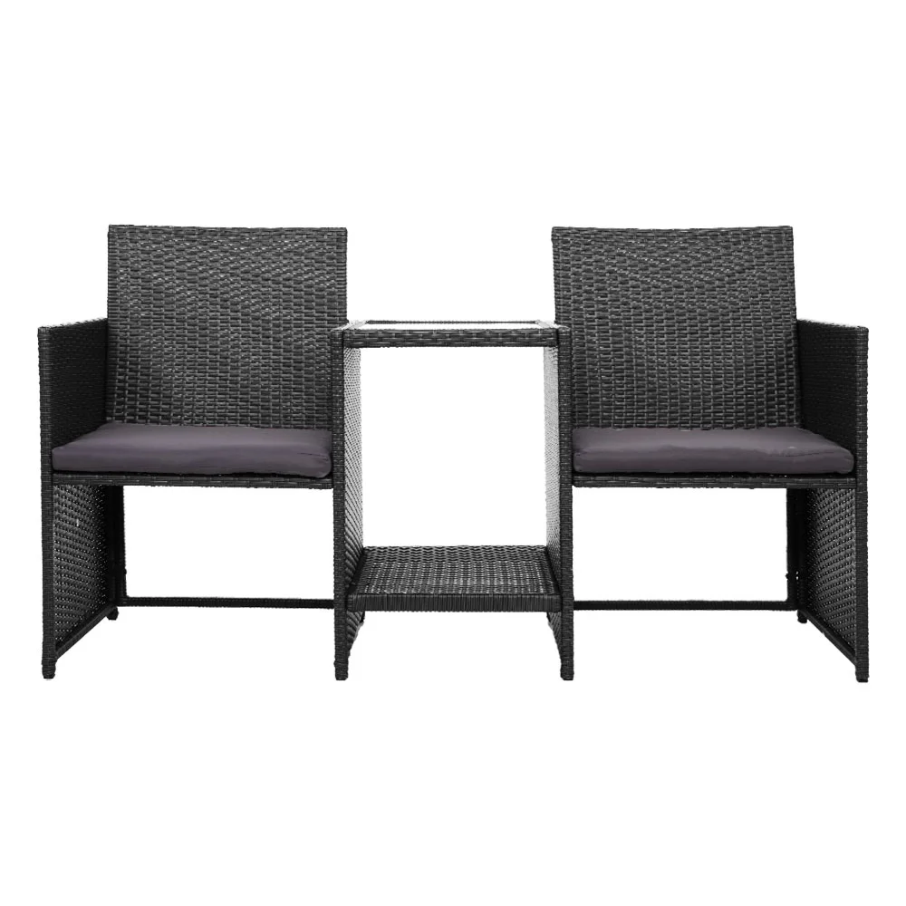 Gardeon Outdoor Wicker Loveseat Bistro Set - UV & Weather Resistant, Black, 153x48x86cm, Steel Frame, Glass Tabletop