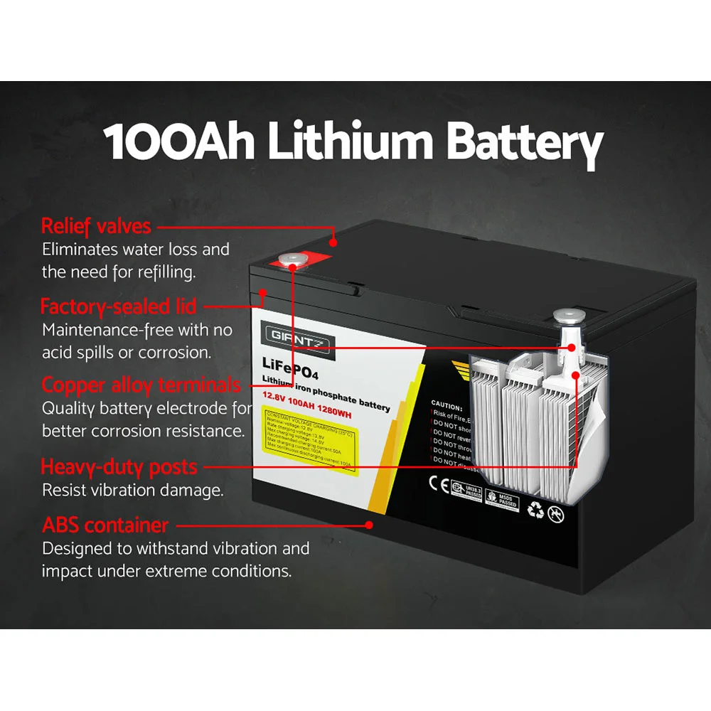Power your adventures and emergencies with the Giantz 12V 100Ah LiFePO4 Lithium Battery. Boasting up to 5000 cycles and a 20-year lifespan, this deep-cycle powerhouse is perfect for caravans, solar setups, and camping. Its built-in BMS ensures protection from overcurrent, short circuits, and overheating. Maintenance-free, spill-resistant, and capable of serial or parallel connections, it’s engineered for reliability and outdoor use. Easily energise 4WDs, fridges, and more—never get stranded again with Giantz.
