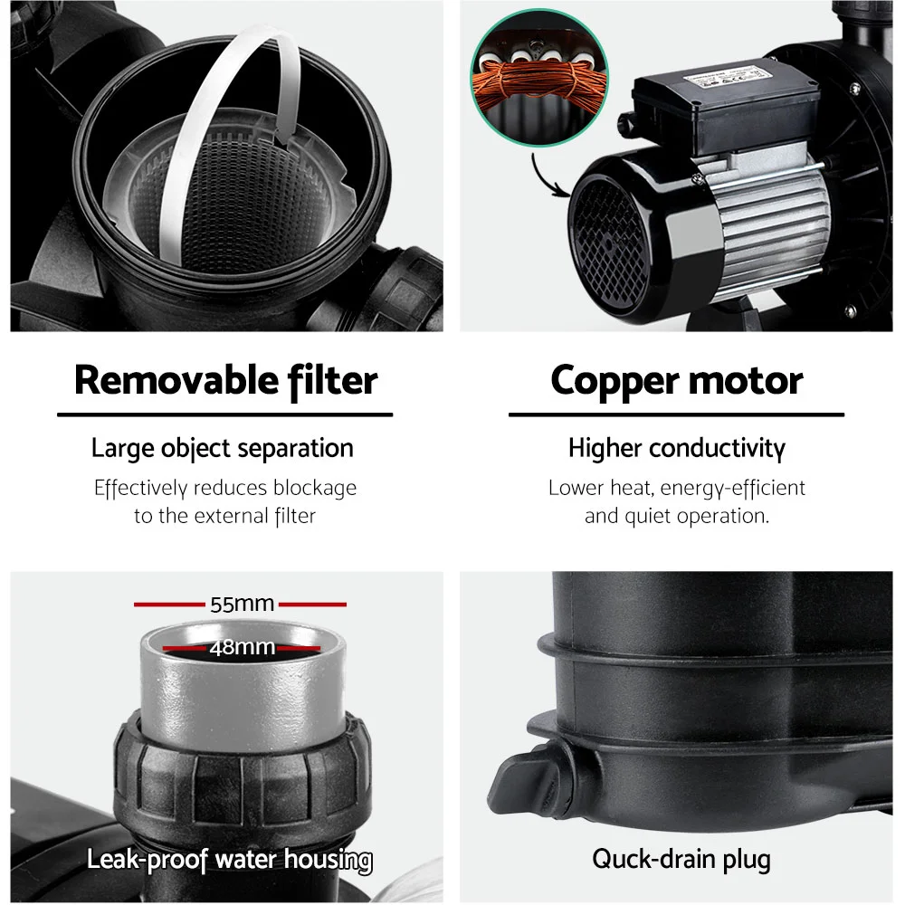 Experience the ultimate in pool maintenance with the Giantz 2000W Swimming Pool Water Pump. Engineered to handle both saltwater and chlorine-filtered pools, this pump boasts a corrosion-resistant marine-grade cast iron motor housing and a chemical-resistant thermoplastic filter cartridge tank body, ensuring exceptional durability and toughness. Its efficient built-in filtration basket captures fine debris, maintaining crystal-clear water effortlessly. Perfect for pools up to 80,000 litres, the pump offers a maximum flow rate of 30,000L/hr, making it ideal for both in-ground and above-ground pools. With its transparent twist-on cover, built-in thermal protection, and easy maintenance features, the Giantz 2000W Swimming Pool Water Pump is your go-to solution for pristine pool water all season long. Comes with a one-year warranty and an instruction manual for hassle-free setup and operation.