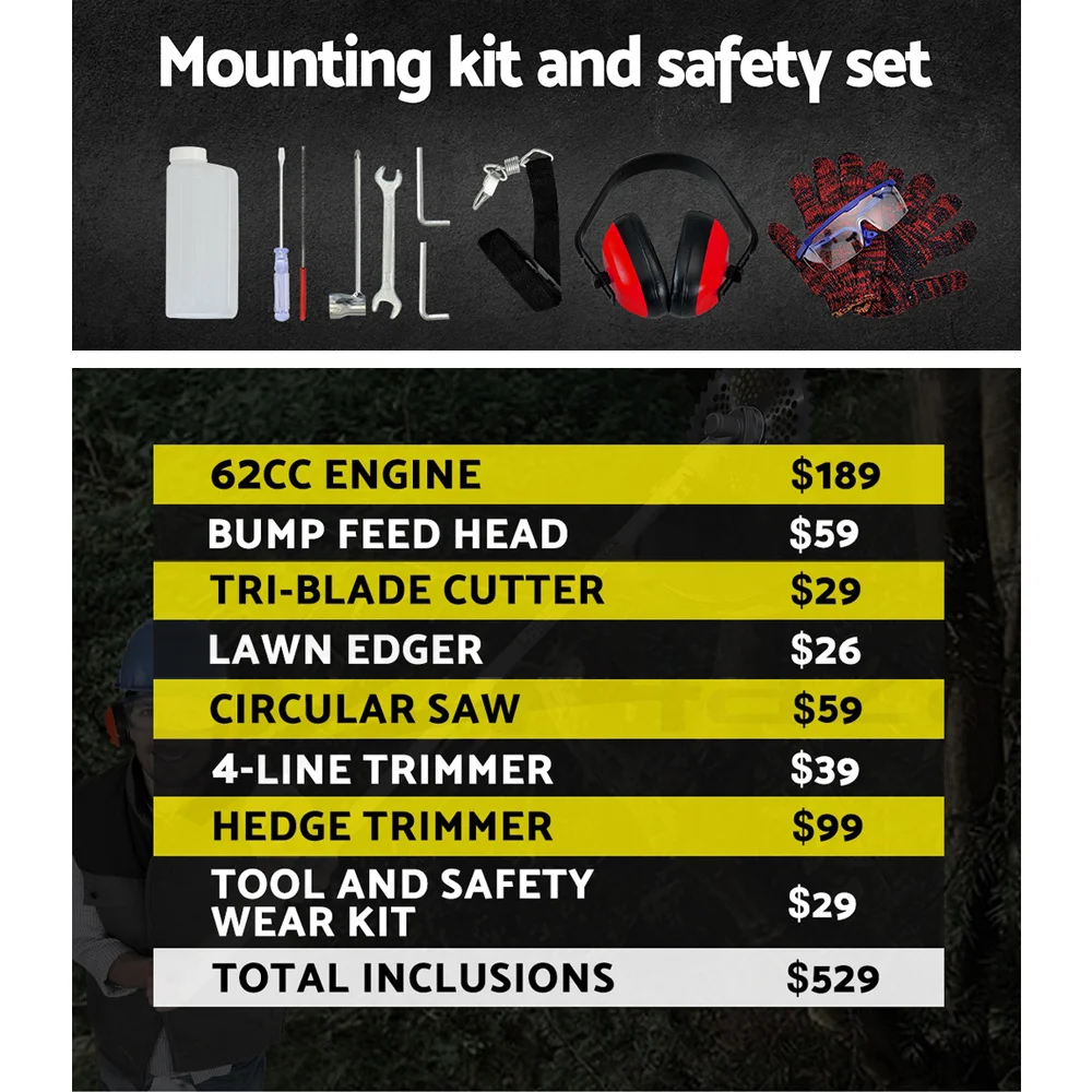 Giantz 62CC Pro-Series 7-in-1 Gardening Tool: Pole Saw, Brush Cutter, Whipper Snipper with Anti-Vibration & Safety Kit