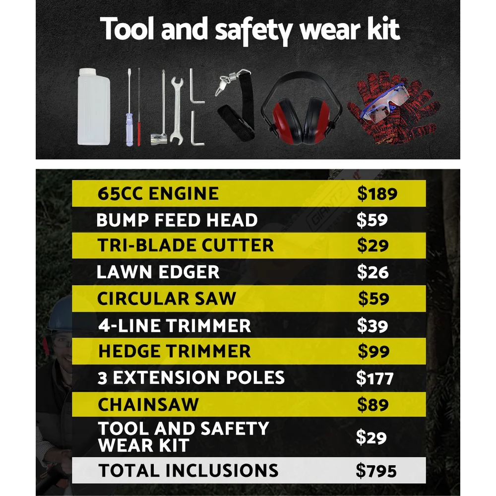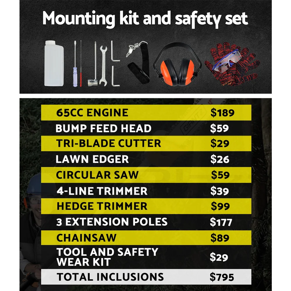 Giantz 65CC 7-in-1 Pole Chainsaw: Hedge Trimmer, Brush Cutter, Whipper Snipper - Pro-Series with 3 Extension Poles