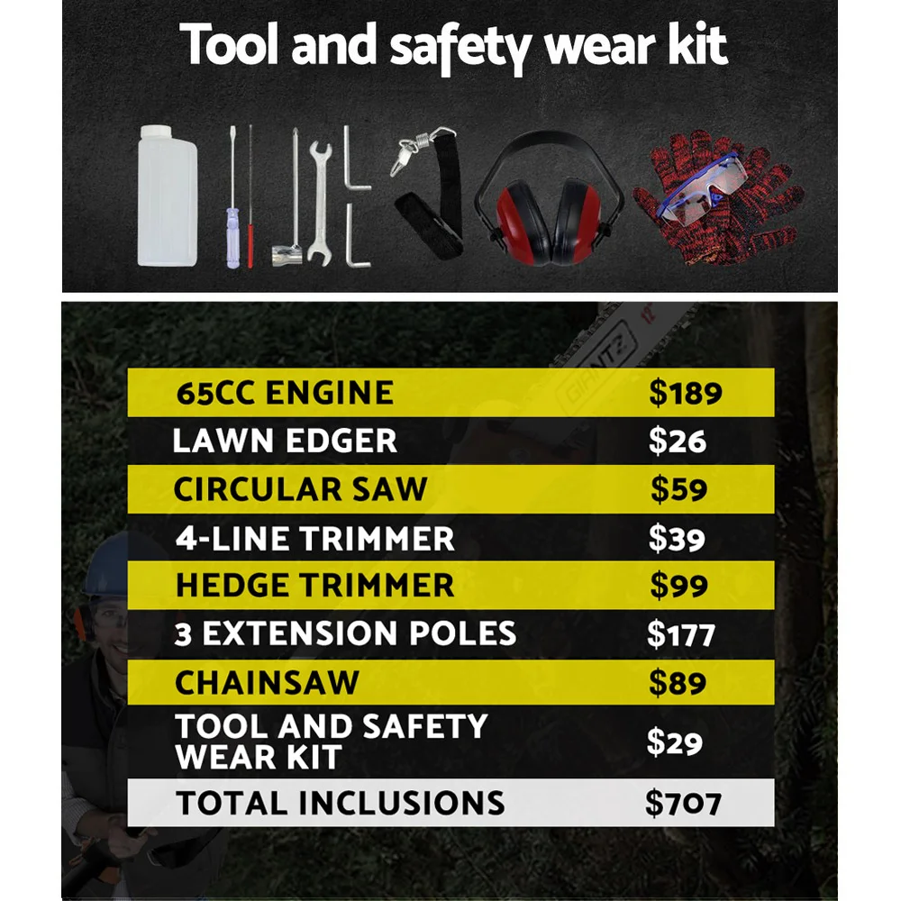 Giantz 65CC 7-in-1 Pole Chainsaw: Hedge Trimmer, Brush Cutter, Whipper Snipper - Pro-Series with 3 Extension Poles