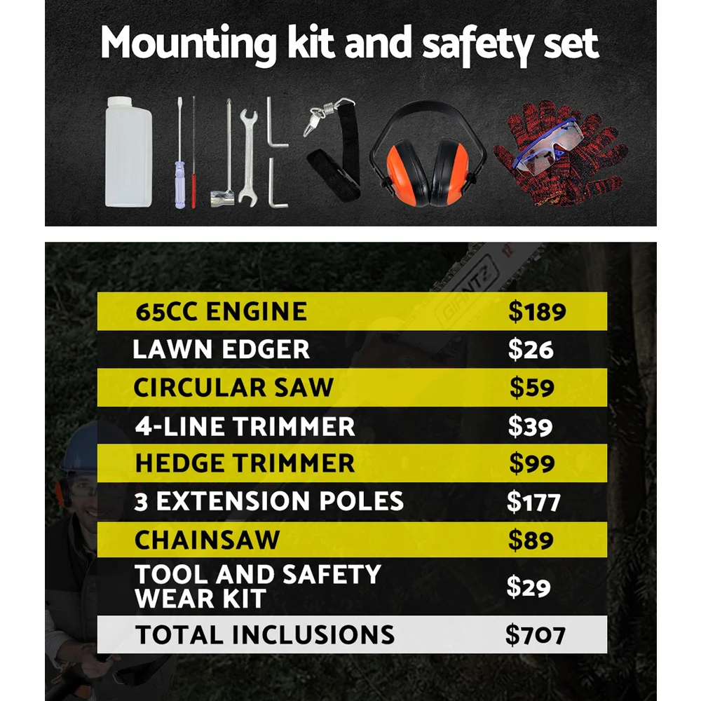 Giantz 65CC Pro-Series 9-in-1 Multi-Tool: Pole Chainsaw, Hedge Trimmer, Brush Cutter & Whipper Snipper, 5.6