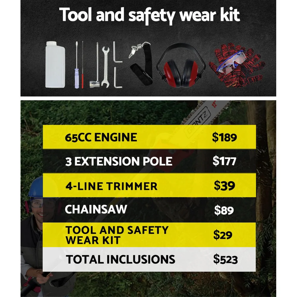 Giantz 65CC 9-in-1 Pro-Series Multi-Tool: Pole Chainsaw, Hedge Trimmer, Brush Cutter, 5.6m Reach, Anti-V