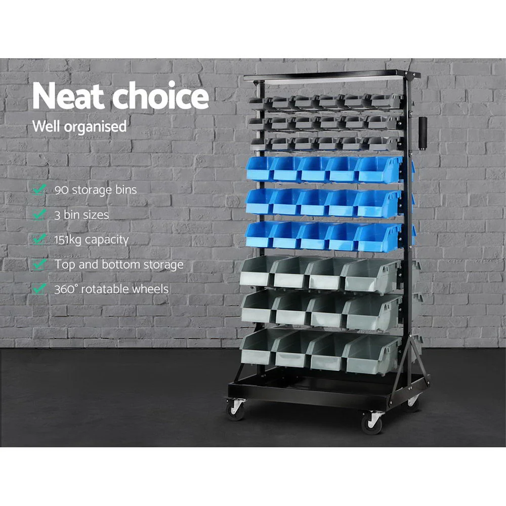 Giantz Double-Sided 90-Bin Storage Rack Stand with Rust-Resistant Steel Frame, Label Slots & Brakeable Wheels for 151kg