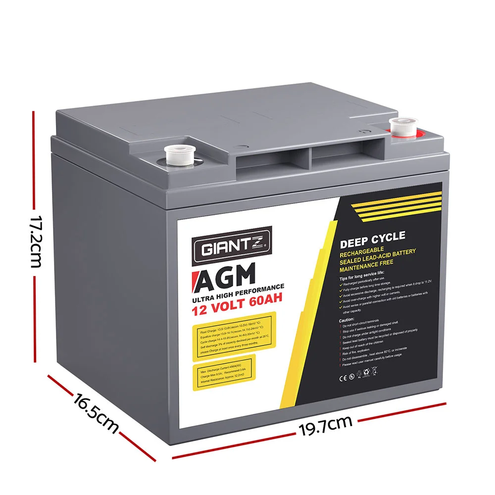 Power your adventures with the Giantz AGM Battery 12V 60Ah Deep Cycle. Engineered for 4WDs, caravans, campers, marine use, and all 12V appliances, this portable battery delivers reliable off-grid energy. With advanced AGM technology for superior charge cycles, deep discharge recovery, and spill-resistant, maintenance-free design, it thrives in all environments. Its compact build and carry handle ensure easy transport, while bolt-down terminals provide secure connections, perfect for camping, travel, and outdoor living.