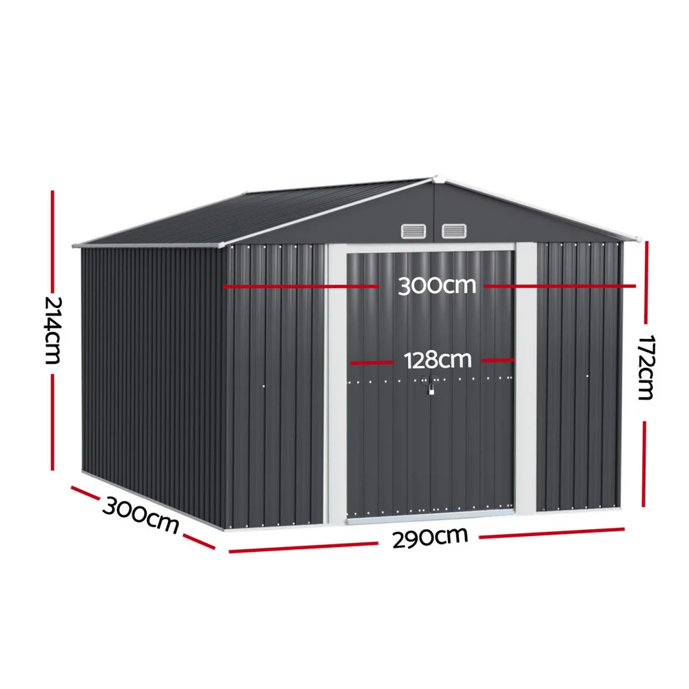 Giantz 3x3M Garden Shed Outdoor Storage Workshop, Galvanised Steel, Double Sliding Doors, Lock, Air Vents, Grey