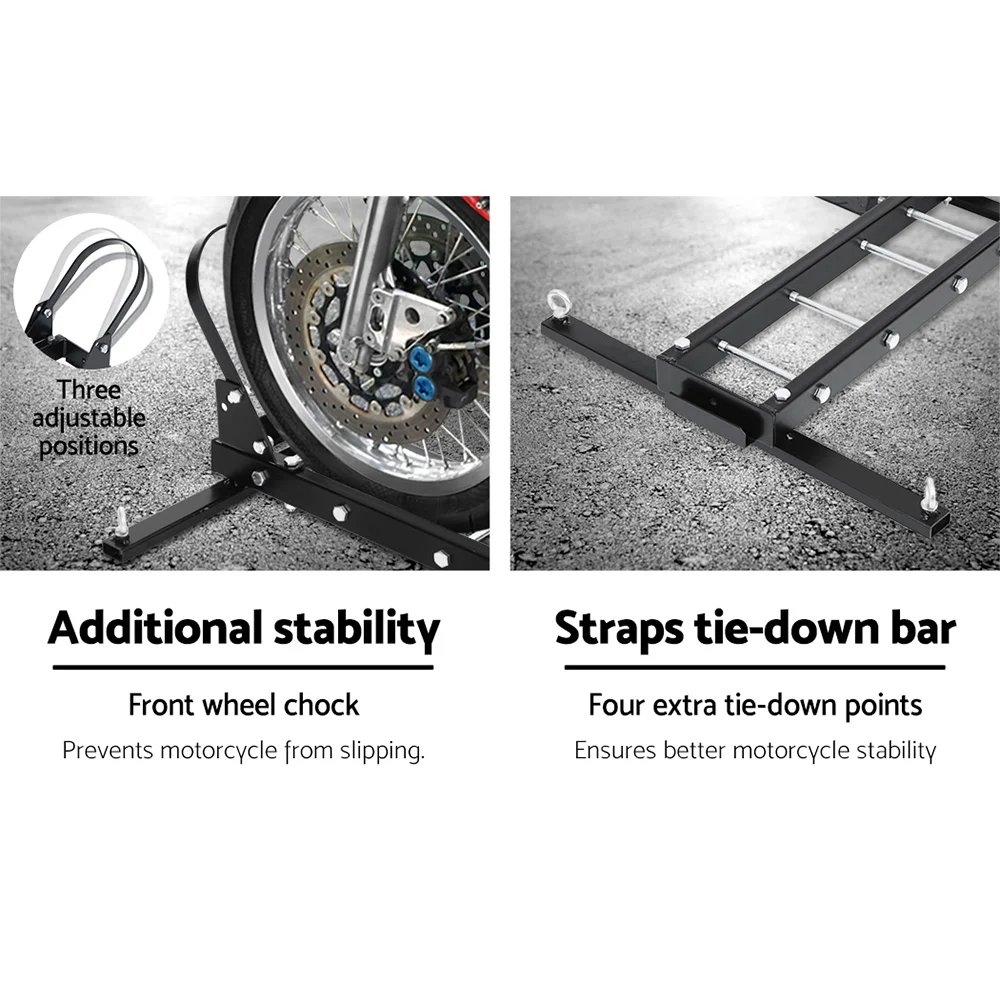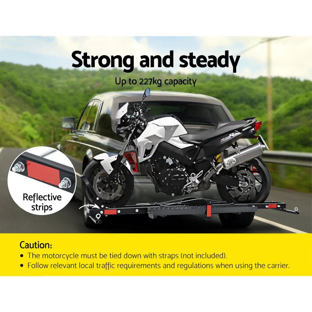 Transport your motorcycle effortlessly with the Giantz Motorcycle Carrier. Designed for versatility, it fits any 2" hitch and supports up to 227kg. Constructed with heavy-duty steel and a powder-coated finish, this carrier ensures durability and reliability. It features an adjustable wheel chock, double-sided loading ramp, and extra tie-down points for secure transport. Ideal for both motorcycles and cars with backup tyres, it offers easy installation and hassle-free operation.