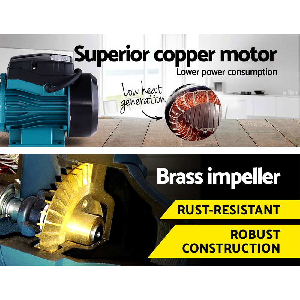 Introducing the Giantz Peripheral Water Pump, your ultimate solution for low water pressure woes. Capable of delivering 35L/min with a head of 35m and suction up to 8m, this robust pump is ideal for a variety of applications including pool pumping, garden irrigation, and car washing. Its IP-rated commercial copper motor, rust-resistant brass impeller, and cast iron body ensure durability and performance. Featuring an automatic controller, TEFC cooling system, and easy plug-and-play installation, this pump is designed for both efficiency and convenience. Simply plug into any Australian standard socket, and you're ready to go!