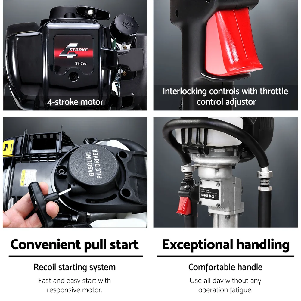 The Giantz Petrol Post Driver 38CC 4-Stroke is engineered for exceptional performance and durability. With its class-leading petrol motor, it effortlessly drives stakes, pegs, and posts up to 80mm in diameter into the ground. Its hardened hammering pin delivers unmatched power and impact frequency, completing tasks swiftly and efficiently. Designed for optimal handling, it features soft rubber grip handles and vibration-absorbing springs to minimise fatigue. The interlocking controls, including throttle lock, kill switch, and throttle adjuster, are conveniently positioned for ease of use. Weighing only 12kg, this portable driver requires no pipes or generators, making it perfect for any job site.