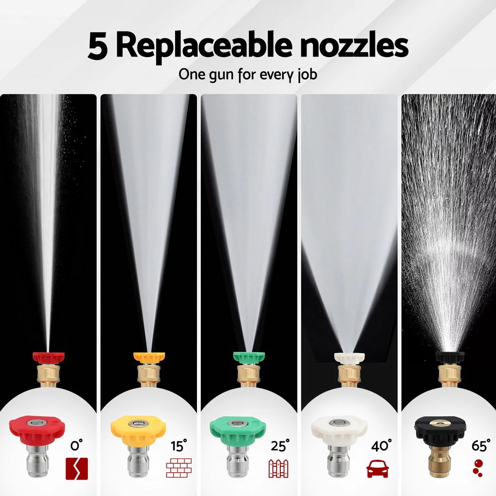 Elevate your cleaning game with the Giantz Pressure Washer Gun Short Trigger. Designed for demanding outdoor tasks, it boasts up to 4000 PSI power and a 3 GPM flow to conquer stubborn dirt on cars, patios, and more. Effortlessly switch between five nozzles for precision cleaning, from a 0° jet to a 65° spray. Made with durable brass, stainless steel, and high-quality plastic, it’s lightweight and easy to handle. The M22-14 inlet and 1/4-inch outlet ensure quick connection to most pressure washers. Transform your washer into a high-performance cleaning tool with the Giantz Pressure Washer Gun.