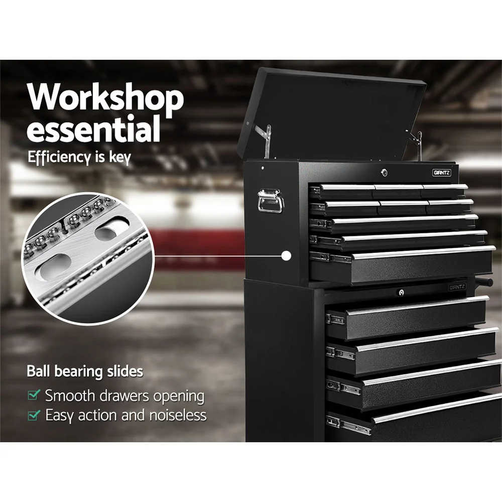 Giantz 15 Drawer Steel Tool Box Cabinet Chest Trolley - Lockable, Non-Slip Liners, 360° Wheels, 68x33x111cm, Black