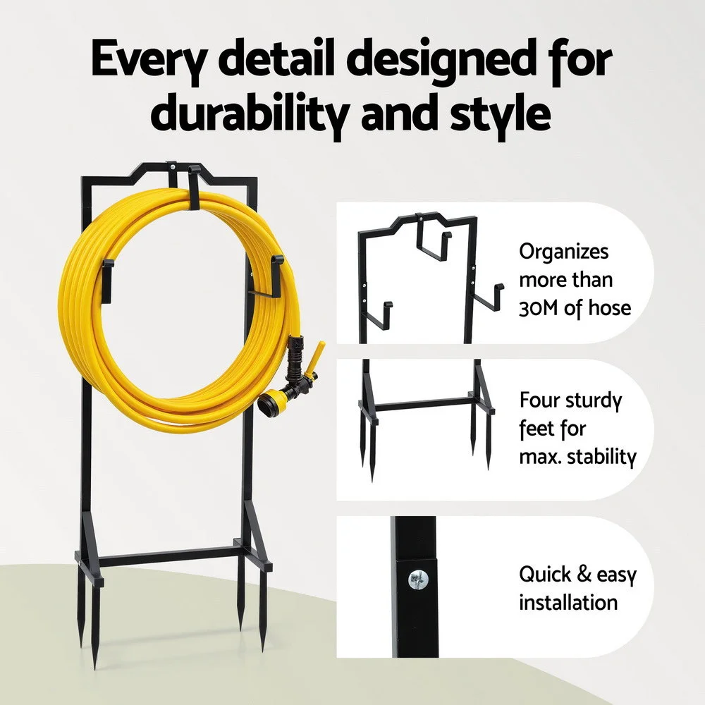 Elevate your garden with the Green Fingers Garden Hose Holder, a sleek and sturdy solution for hose management. This portable and freestanding hose stand boasts a robust four-spike base for superior stability, ensuring hoses up to 30 metres remain secure even on uneven terrain. Crafted from durable powder-coated steel, it resists rust and weather, promising long-lasting reliability. Its detachable design allows for easy relocation, storage, and maintenance, while quick assembly requires only a screwdriver. Keep your garden tidy and organised effortlessly with this heavy-duty, weatherproof hose holder.