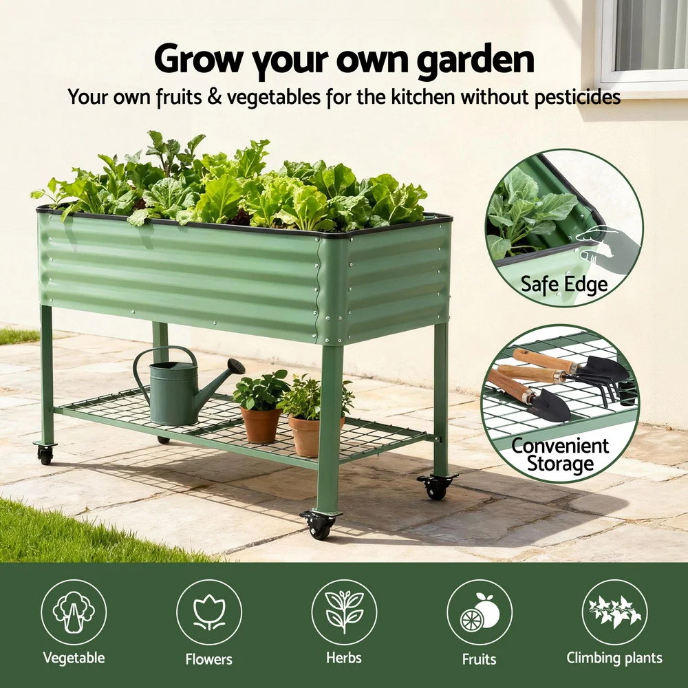 Green Fingers Mobile Elevated Garden Bed Kit, Galvanised Steel, 115x60x81cm, Locking Wheels, Storage Shelf, 100KG Load