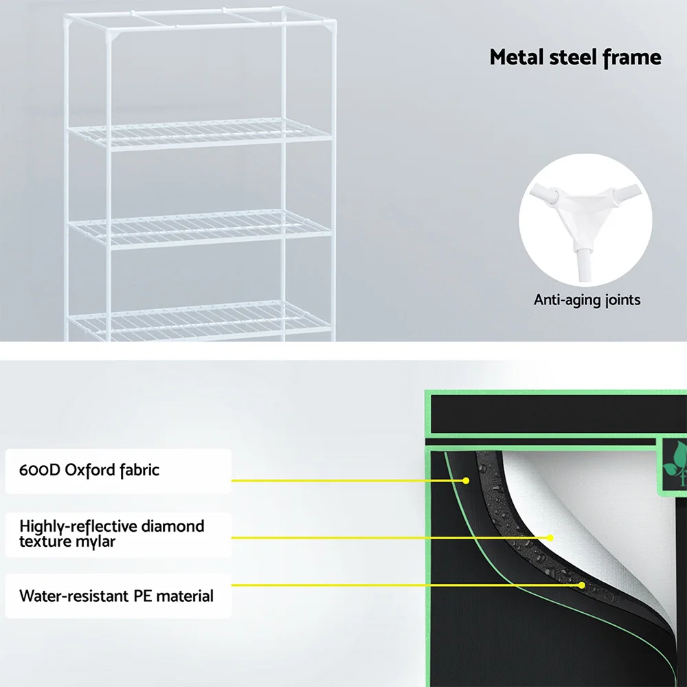 Discover the ultimate indoor gardening experience with the Greenfingers Grow Tent. Perfect for novices and experts alike, this 100x60x180cm hydroponics system features durable powder-coated steel construction, a transparent view door, and four removable shelves. Its 600D oxford cloth exterior and highly reflective diamond texture Mylar interior ensure optimal growth conditions. Equipped with ventilation ports, a waterproof floor tray, and heavy-duty support bars, it's designed for Australian climates, all backed by a 1-year warranty.