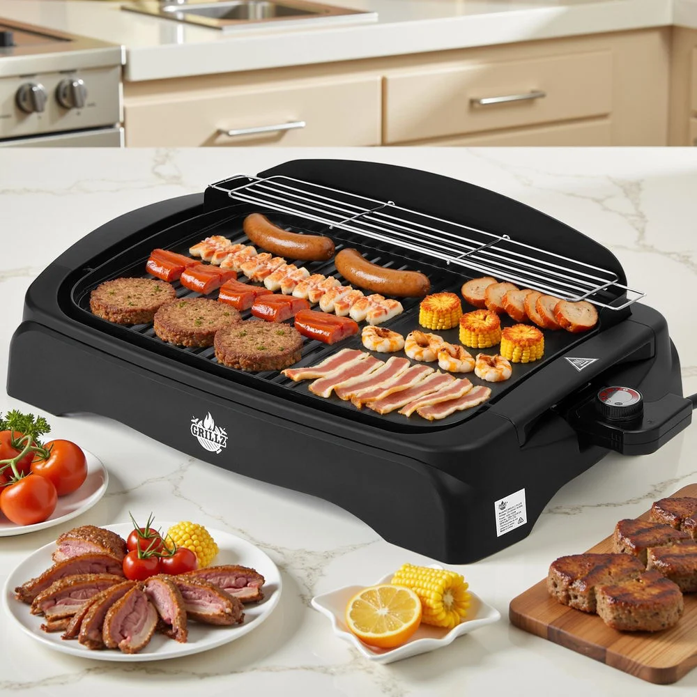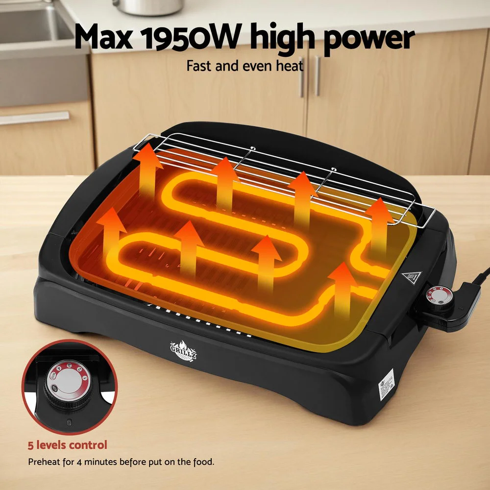 Grillz 1950W Electric BBQ Grill – Non-stick, Smokeless, Indoor/Outdoor, Large 52x36cm Plate, 5 Heat Settings, Easy Clean