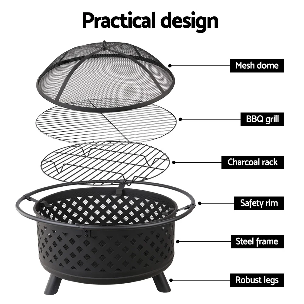Grillz 2-in-1 Fire Pit BBQ Grill, Steel, 82cm, Black, All-Season Outdoor Table with Safety Ring and Accessories