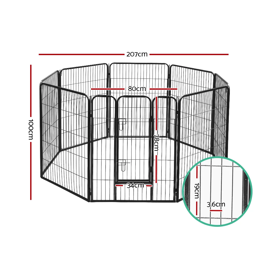 The i.Pet 40" 8 Panel Dog Playpen is the perfect solution for creating a safe and secure play area for your beloved pets. Designed with versatility in mind, its foldable design allows for easy storage and transportation, letting you configure it into various shapes. Crafted with strong steel frames and a black powder-coated finish for enhanced durability, this playpen is rust-resistant and features round edges for added safety. With a secure lock system on the access door and SGS approval, setup is a breeze with no tools required. Ideal for dogs, ducks, rabbits, guinea pigs, and more!