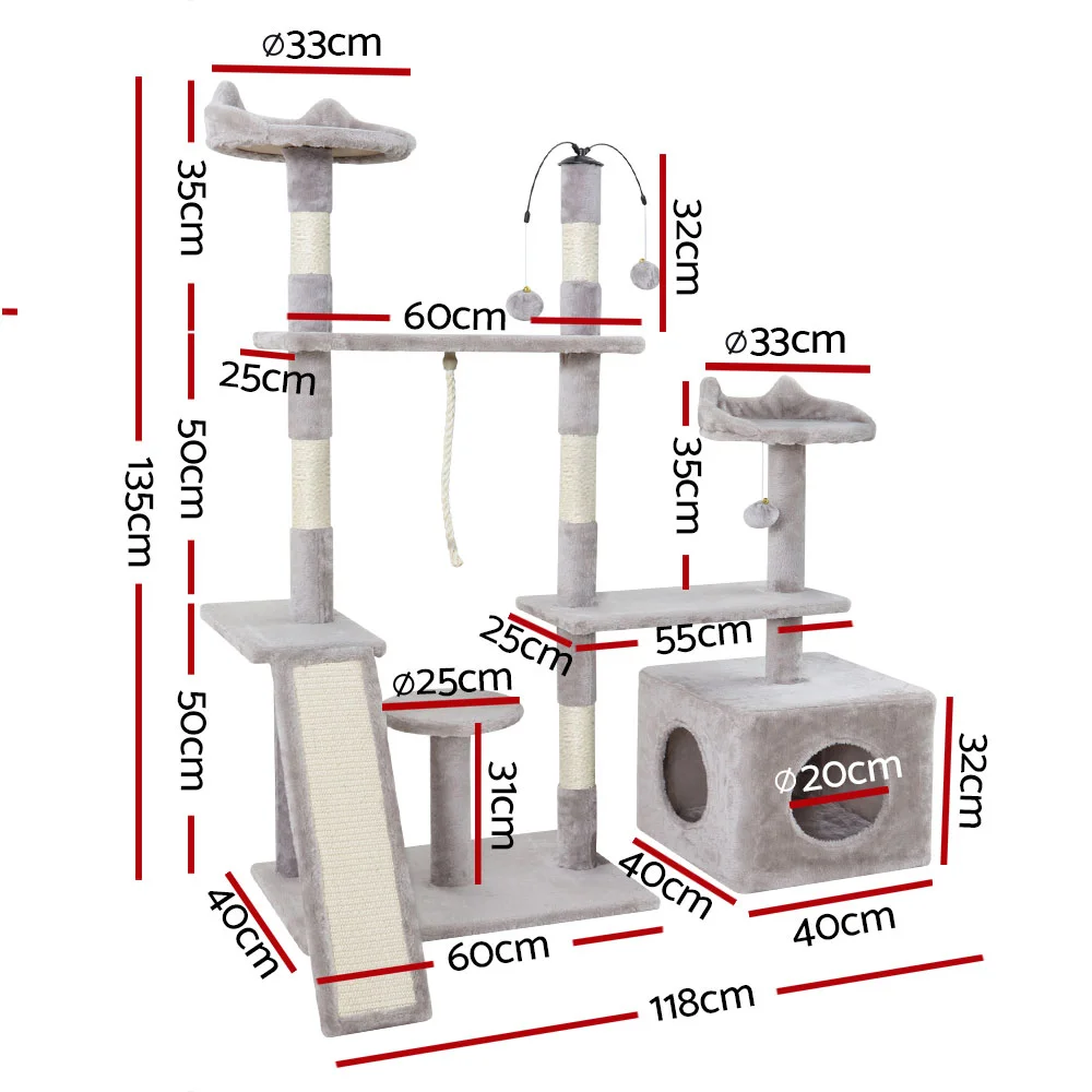 i.Pet 145cm Cat Tree Tower in Light Grey - Durable Sisal Scratching Posts, Plush Velvet, Multi-Level Condo & Play Areas