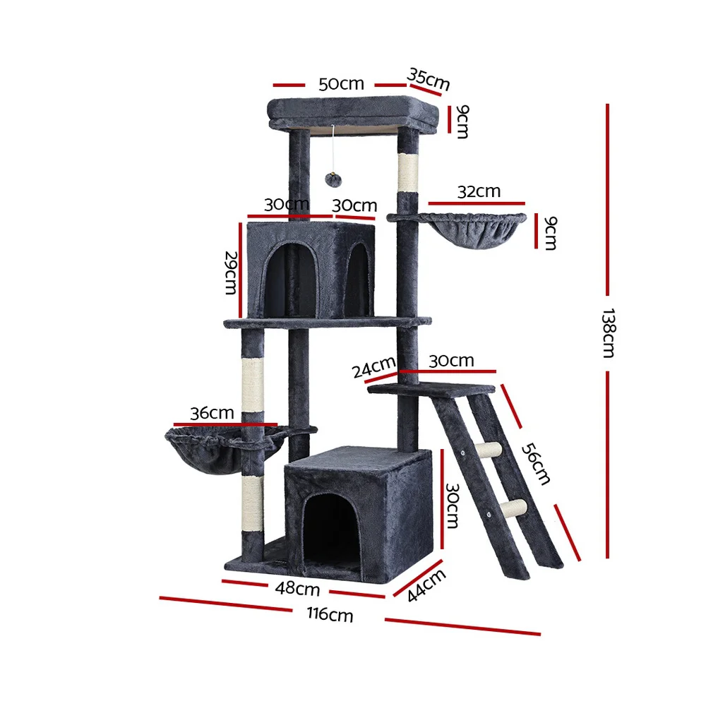 Unleash your cat's wild side with the i.Pet Cat Tree Tower. Standing at 138cm, this grey cat condo offers endless fun with its multi-level design, featuring two bed cubicles, two sleeping cradles, a climbing ladder, and a playful hanging ball. Its sturdy wooden construction and stable base ensure durability, while the soft plush cover and natural sisal posts satisfy scratching instincts without harming your furniture. Perfect for climbing, scratching, or lounging, it's a feline paradise.