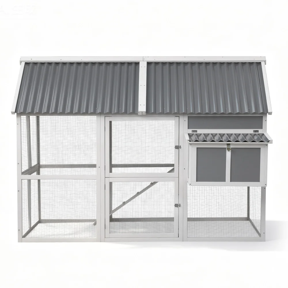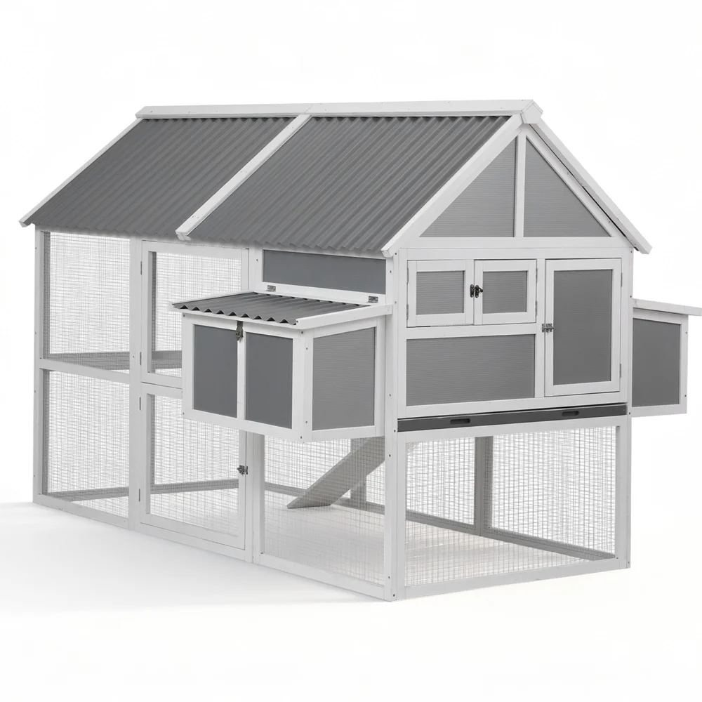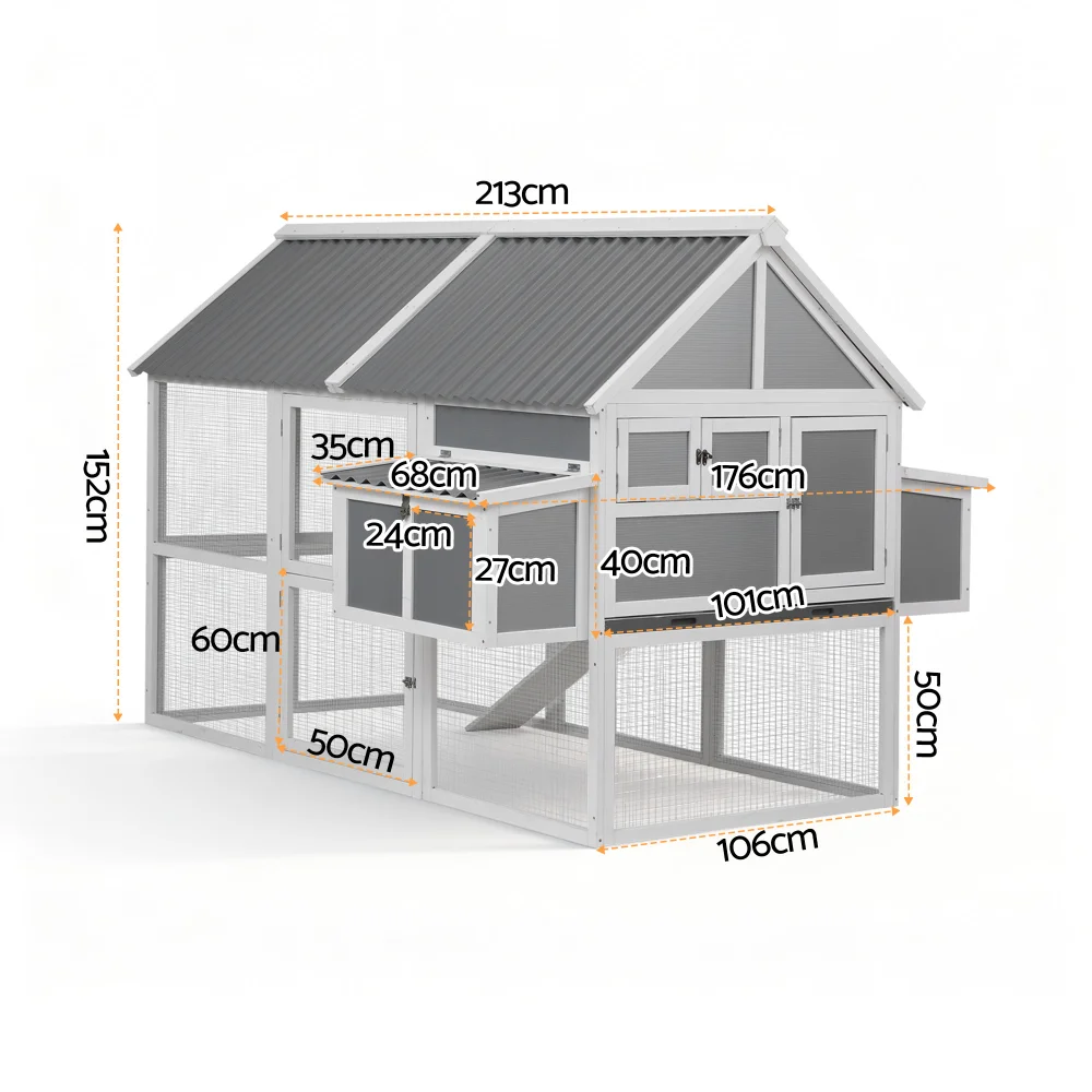 i.Pet Deluxe Large Chicken Coop & Hutch, Fir Wood, Weather-Resistant, 213x176x152cm, Grey/White, Easy Clean & Secure