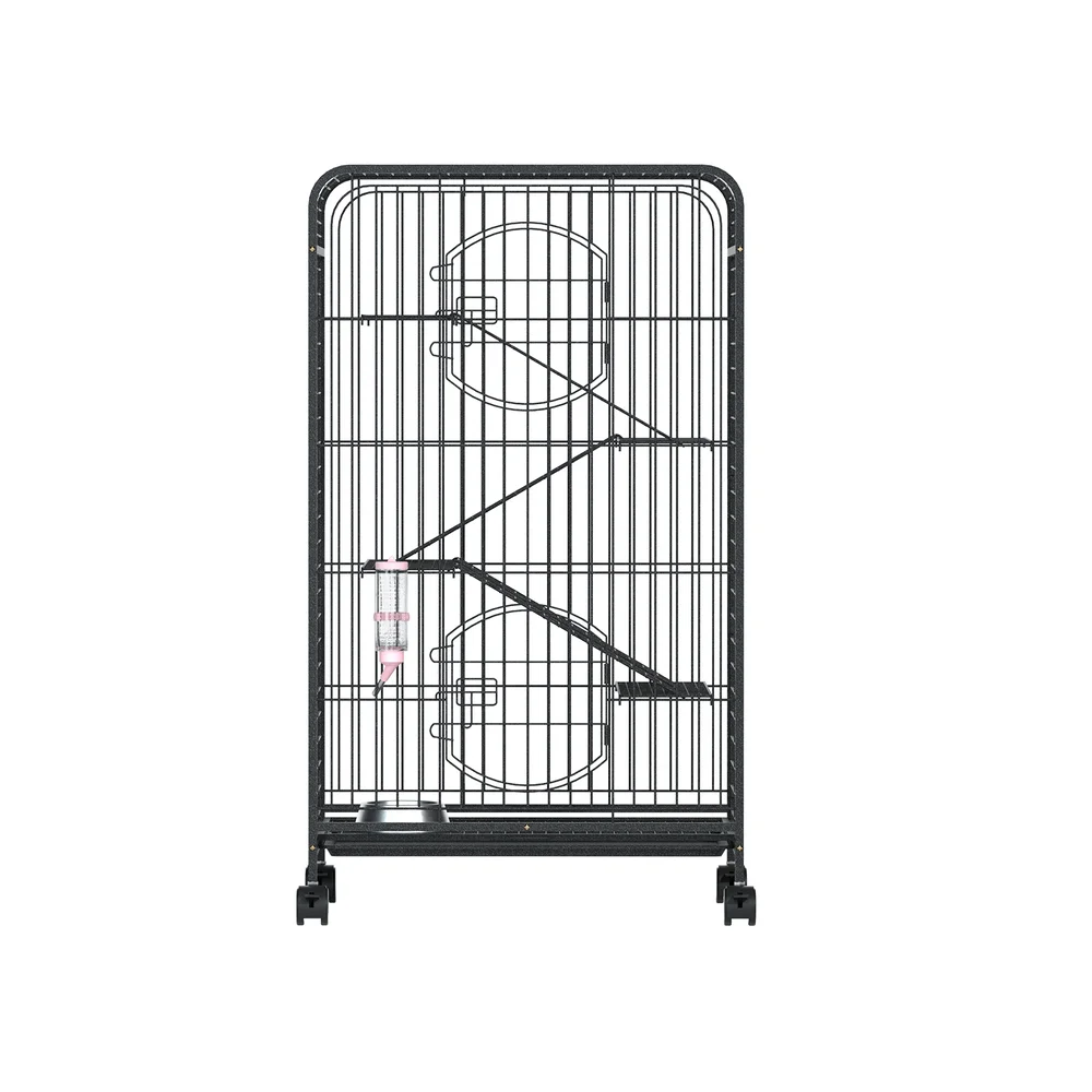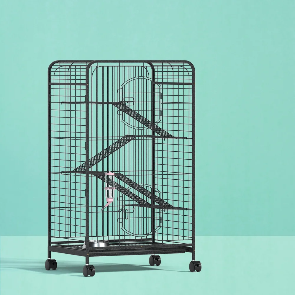 The i.Pet Rabbit Cage Indoor Hutch is a versatile sanctuary for your pets, offering abundant space to explore across four dynamic levels. Crafted from sturdy, rust-resistant black powder-coated steel, it promises durability and safety. Easy access is ensured with two large doors, a removable cleaning tray, and secure locks. Plus, the cage is mobile with smooth castor wheels. A water bottle and feeder are included, making it a complete habitat. Assembly is simple, and a 1-year warranty guarantees peace of mind.