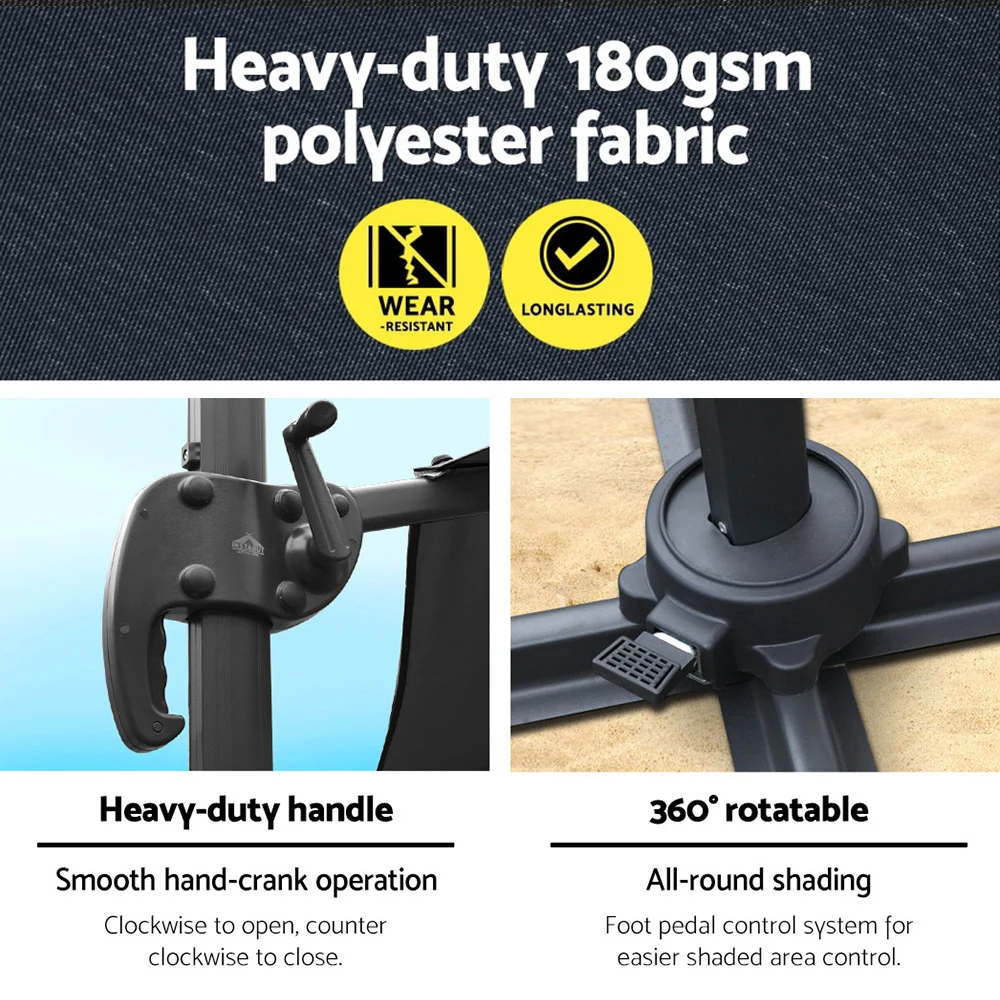 Soak up the sun while staying cool under the Instahut 3m Outdoor Cantilever Umbrella. Its robust aluminium frame supports a UV50+ octagonal canopy, perfect for summer. Crafted from water and wear-resistant polyester, it withstands any sunny adventure. The portable, water-fillable base ensures versatility from beach to backyard, while the washable canopy keeps it fresh. Enjoy the perfect blend of sunshine and shade. Note: Umbrella base not included. This product comes with a 1-year warranty.