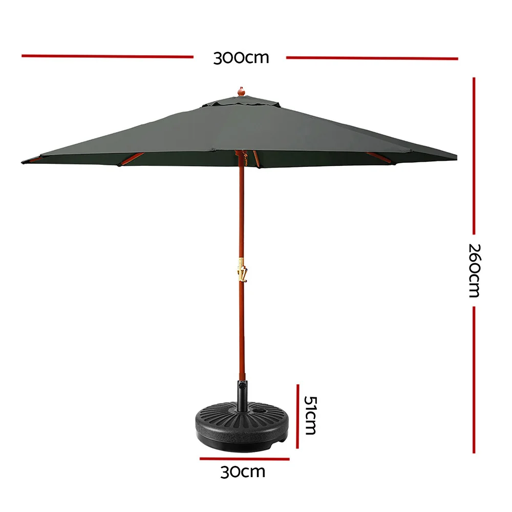 Instahut 3m Outdoor Umbrella with Base - Charcoal, UV50+ Protection, Water-Resistant Polyester, Oak Frame, Portable