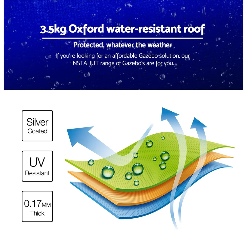 Discover the ultimate outdoor companion with the INSTAHUT Gazebo Pop Up Marquee 3x3 Folding Tent. Crafted from robust 500D Oxford fabric with a PU coating, this tent offers superior UV and water resistance. Its user-friendly design ensures quick setup with a sturdy powder-coated steel frame and adjustable height levels, making it perfect for events, camping, and more. Enjoy peace of mind with a 1-year warranty. Note: Not for extreme weather or prolonged use.