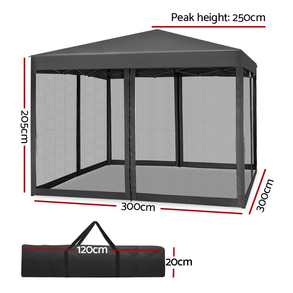 Instahut Gazebo 3m x 3m Outdoor Tent - UV & Water-Resistant, Insect-Proof Mesh, Double-Zip Entrances, Grey Canopy