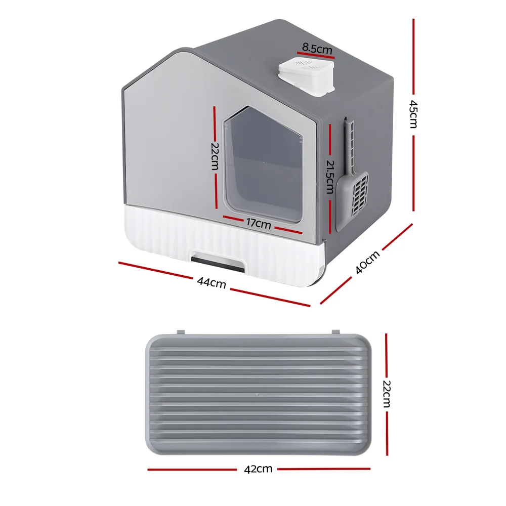i.Pet Large Foldable Enclosed Cat Litter Box with Ventilation, Removable Tray & Scoop - Grey 48.5x38.5cm, PP Material