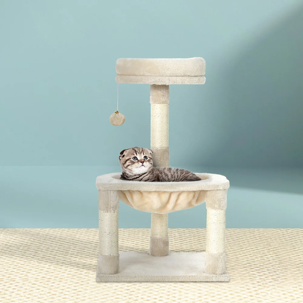 The i.Pet Camila Cat Tree is the ultimate playground and lounge spot for your feline friend. Standing at 69cm, this small-sized, three-level cat tree offers a bed, hammock, and resting platform, along with a hanging activity ball to satisfy your cat's playful instincts. The natural sisal-covered scratching post keeps furniture safe from claws, while the plush velvet cover ensures cosy naps. Built with sturdy wood and a stable base, it provides durability and peace of mind. Easy assembly makes it a perfect addition to any home.