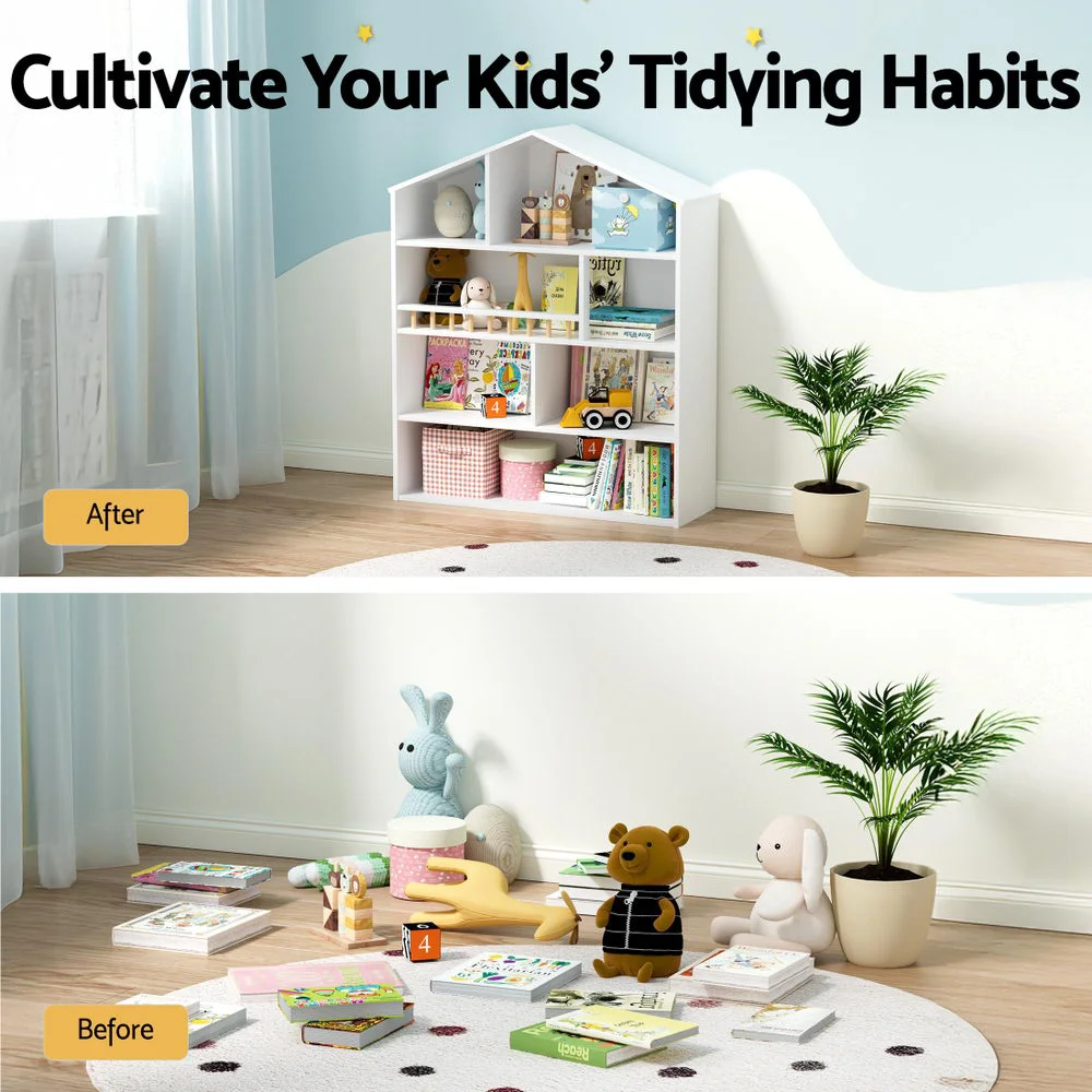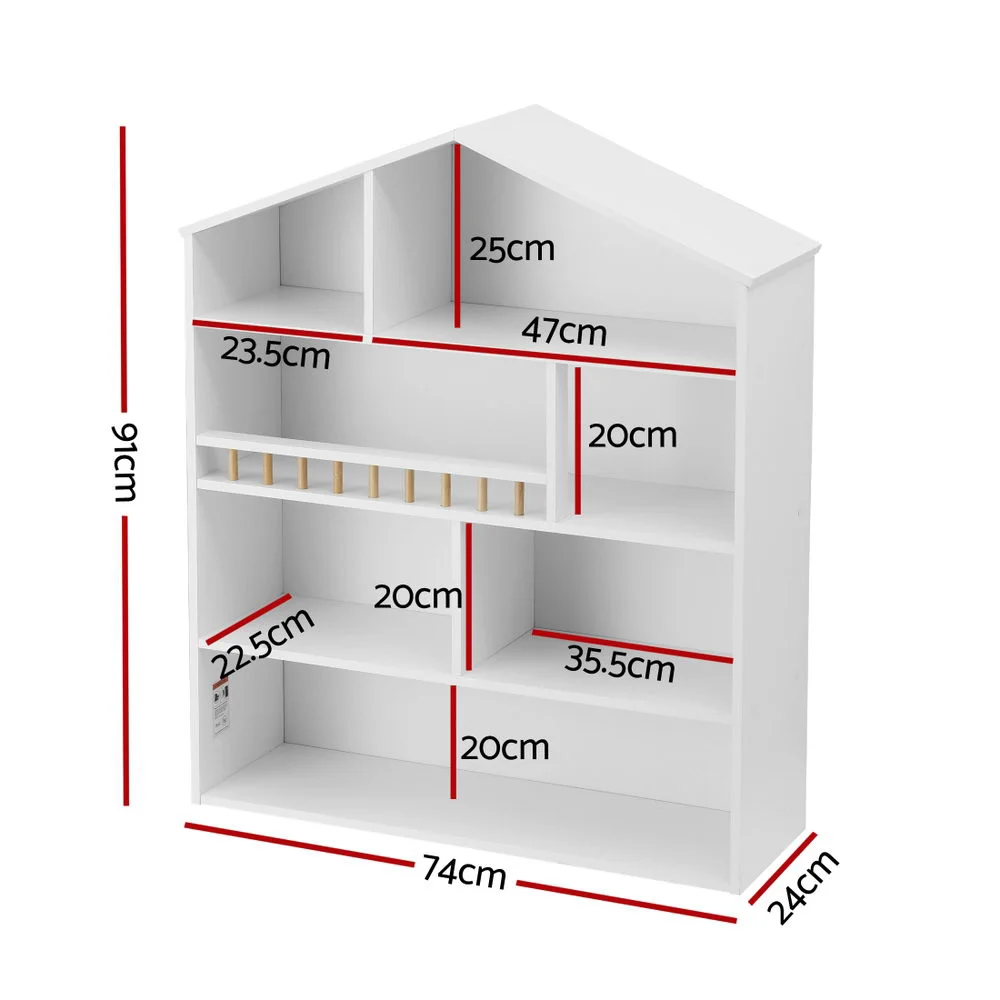 Keezi 4-Tier Kids Bookshelf - White Wooden Bookcase with House Design, Easy-Clean Melamine, 91x74x24cm, Anti-Tip Safe